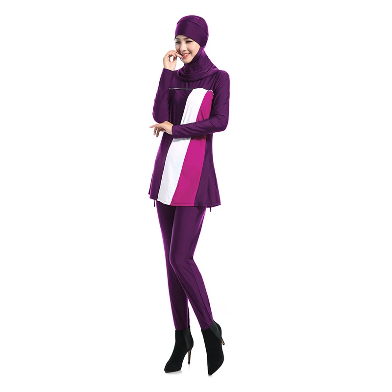 Особенности товара:1. Брюки с дизайном, не скользят по ноге.2. Полное покрытие корпуса от головы до ног. Полная защита тела в буквальном стиле. В комплект входит даже головной убор.3. Длинный рукав, длинные штаны, без кожи.Материал: полиэстер + спандексЦвет: фиолетовый/черный/небесно-голубой/темно-синийРазмер: S-4XLПосылка включает в себя: 1 комплект (3 шт.) * Купальник (топ + штаны + шляпа)