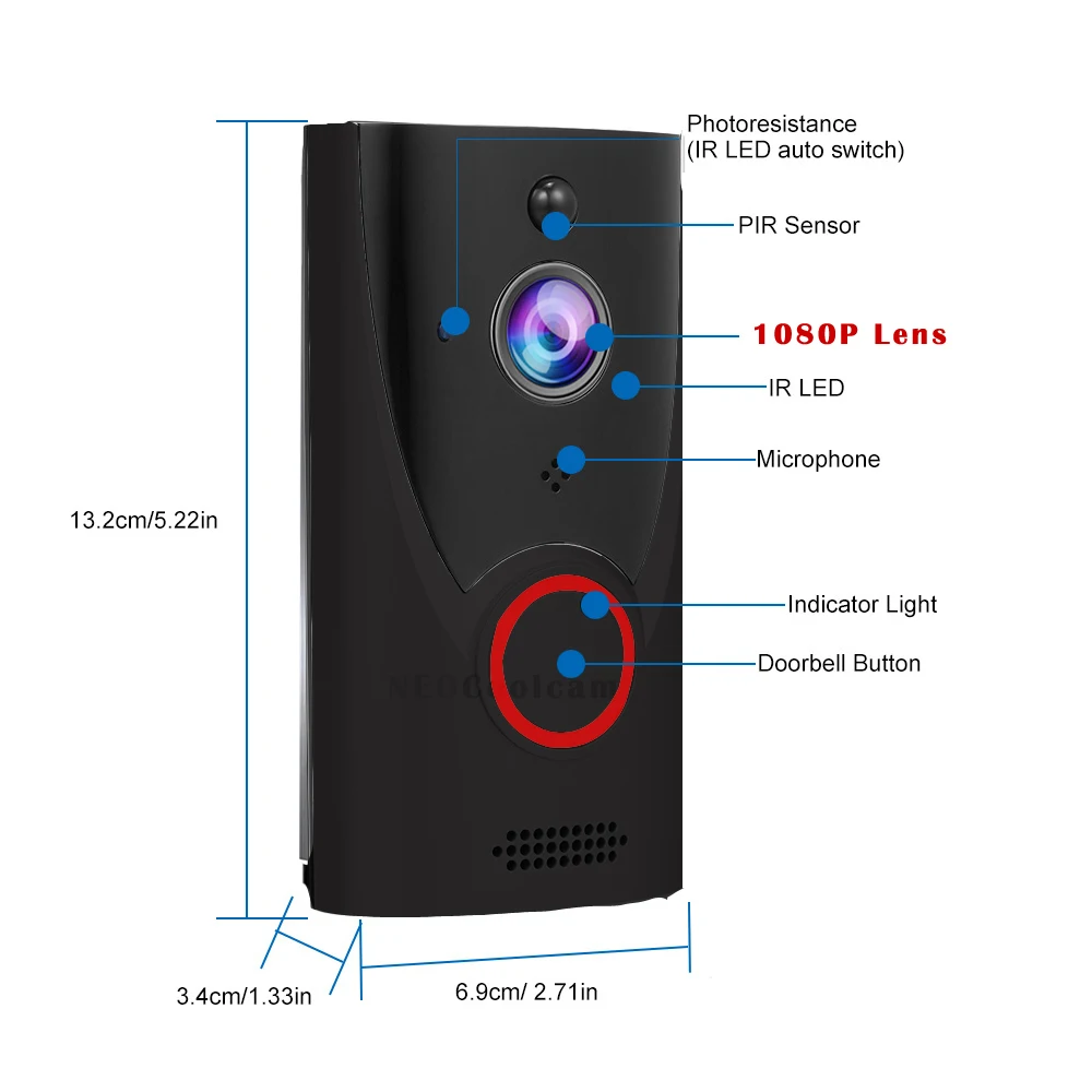 1. Поддержка Wi-Fi 2,4 ГГц IEEE 802.11b / g / n, без каких-либо линии. 2. Изображение HD 1080P имеет широкий угол обзора 166 ° для более четкого и более широкого угла обзора. 3. 6 IR-LUT режимов фильтра автоматически переключаются оптическими датчиками для мониторинга и захвата изображений в условиях низкого светильник. 4. 2x18650 батареи (не входят в комплект) источник питания, Ультра низкое энергопотребление 5. Функция обнаружения движения PIR и защиты от взлома, она может автоматически записывать или снимать фотографии и отправлять информацию о вашем сигнале на телефон, когда происходит действие. 6. Поддержка мониторинга мобильный телефон (для iOS, для Android). Вы можете посмотреть за дверью, и когда вы обнаружите посетителя за дверью, вы можете сделать видео и аудио звонок и записать короткое видео. 7. Чувствительность к обнаружению движения может быть скорректирована, чтобы избежать ложных сигналов тревоги и экономии энергии. 8. Встроенный супер Wifi модуль приемопередатчика, может легко справиться с такими препятствиями, как двери из нержавеющей стали, деревянные двери, железные двери. 9. Двусторонняя голосовая связь с AEC, встроенным динамиком и микрофоном для обеспечения четкого голосового домофона.