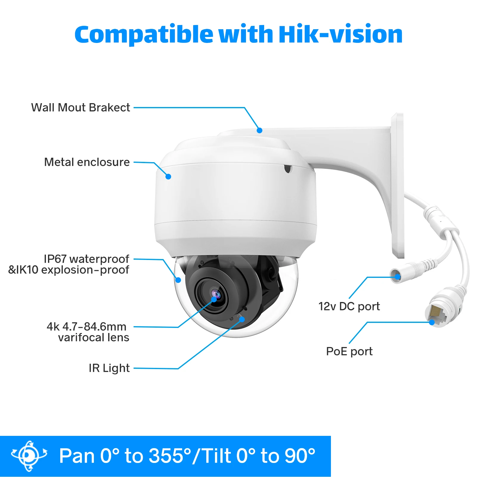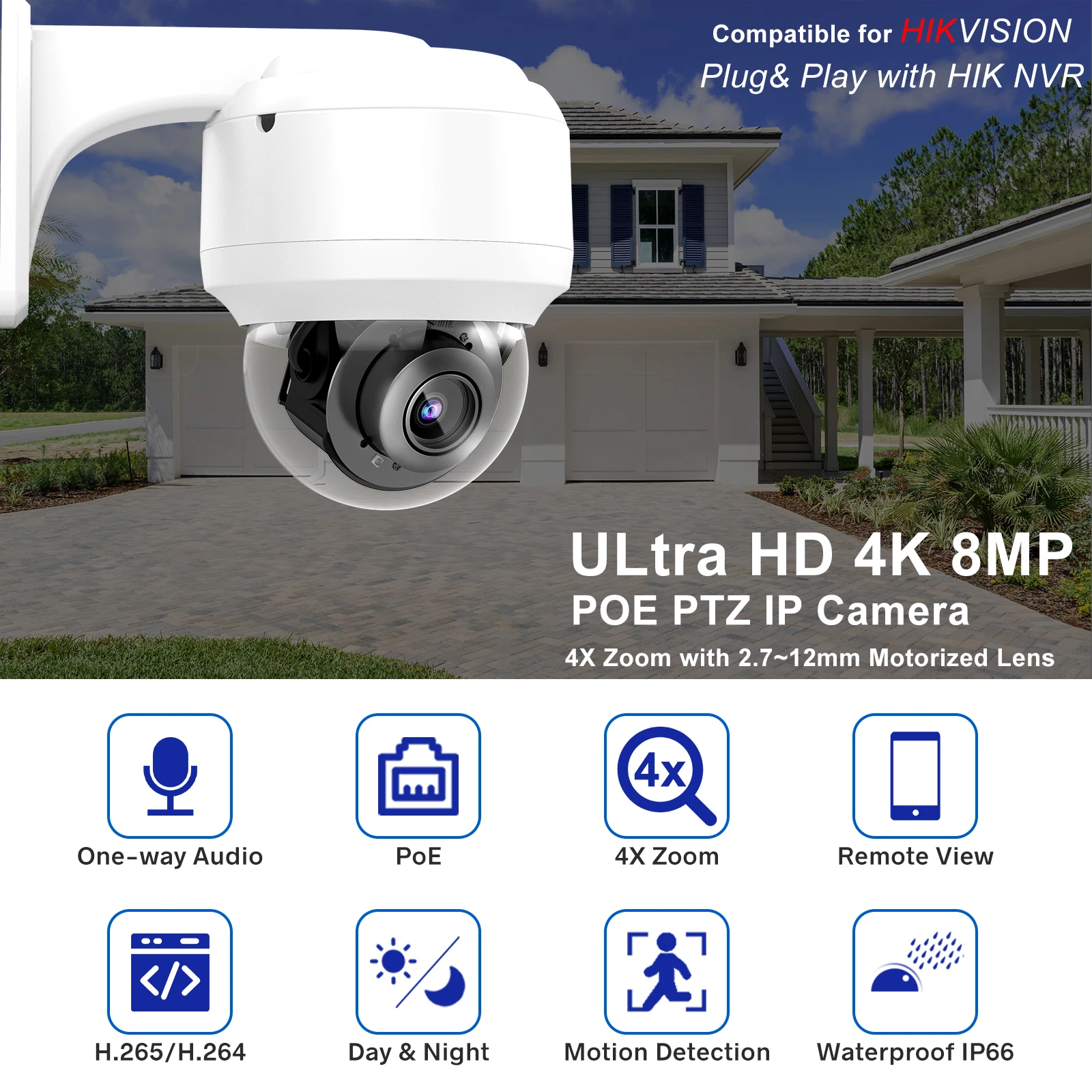 4K 8MP 5MP PTZ 4X зум ip-камера > 1/2.5 ”8 Мп CMOS/ 5 Мп CMOS > Мощный оптический зум 4x > WDR, день/ночь (ICR), Ultra DNR > Макс. 20 кадров в секунду @ 8 МП/30 кадров в секунду @ 6 МП/Макс. 25fps @ 5MP/25fps @ 4MP > Диапазон панорамирования: от 0 до 355 °, Диапазон наклона: от 0 до 90 ° > Поддержка POE > Совместимость: HIKVISION,ONVIF > IP66, IK10 > Встроенный микрофон