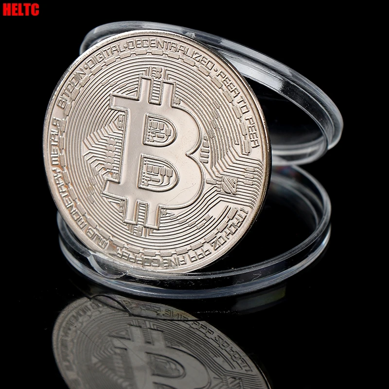 Монета Биткоин Серебристая золотистая с акриловым чехлом, юбилейная...
