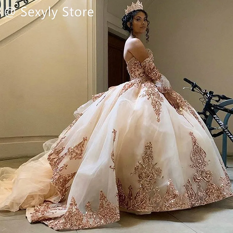 Блестящие Розовые золотые платья для Quinceanera 2020 бальное плать...