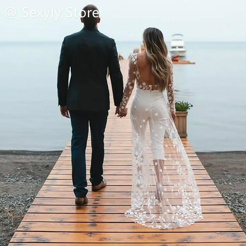 Шикарное летнее свадебное платье в стиле бохо, костюм с брюками, сексуальное прозрачное кружевное богемное свадебное платье с открытой спиной и длинным рукавом для женщин