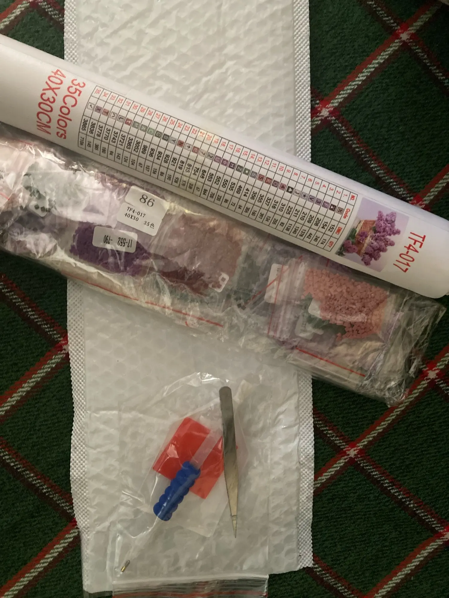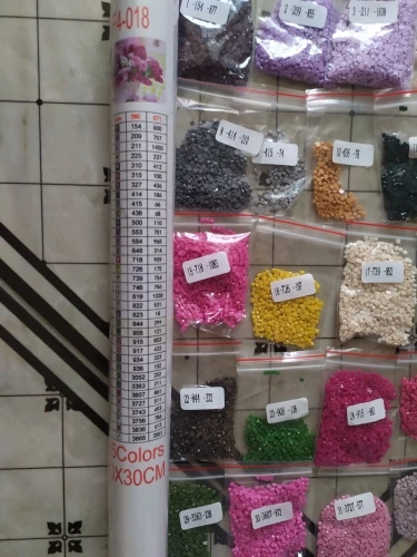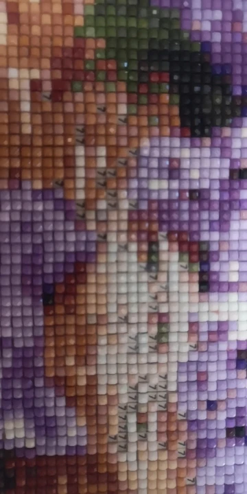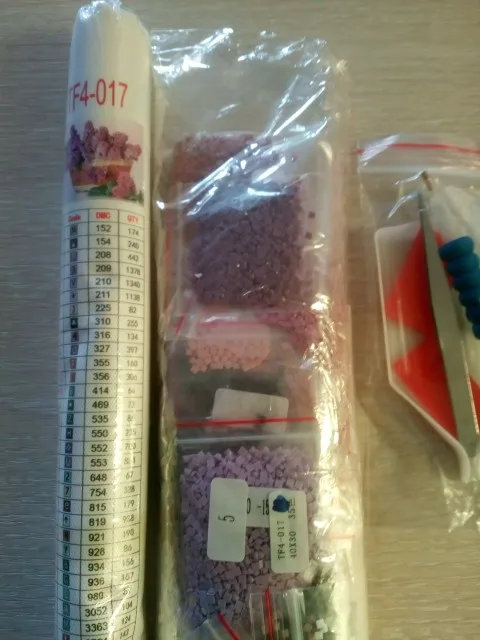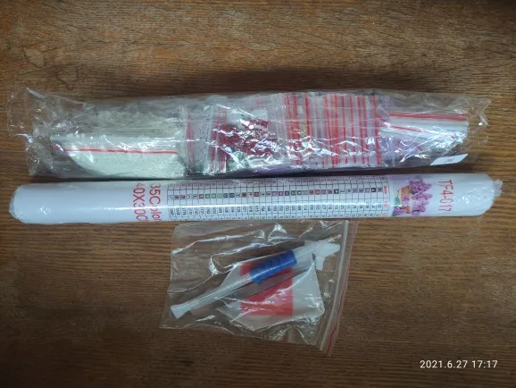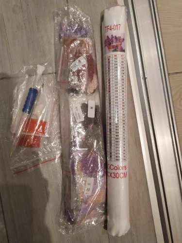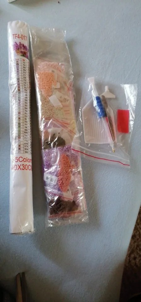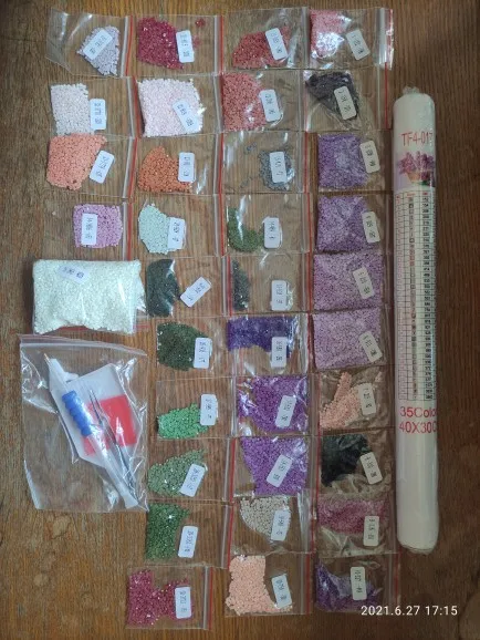Очень довольна. Складывать такие картины интересно. Картина размером 39х29см (размер всего холста: 50х35см), 35 цветов. Квадратных алмазиков/страз и клея/липучки - с запасом. Без постороннего запаха. Зип-пакетики пронумерованы от 1 до 35 и дополнительно номера в DMC и QTY. В инструкции указанно: "Что бы гарантировать степень клейкости холста, понемногу открывайте защитную плёнку на холсте, по мере наклеивания алмазов, нельзя за один раз отрывать плёнку от всего холста. Холст держать в чистоте, беречь от пыли, воды". Уже складывала такие картины раньше. Несколько штук покупала на подарок ребёнку и взрослому человеку. Полотно было намотано на цилиндр/валик из "вспененного полипропилена" или типа того, для придания жесткости. В комплекте убогий пинцет, стилус с насадками, удобный лоток, липучка. Товар выслали в течение дня. Приехало в пупырчатом пакете-конверте. Полотно слегка примялась, но в целом содержимое выжило. Письмо было заказное, отслеживалось на всём пути и доехало за 18 дней.