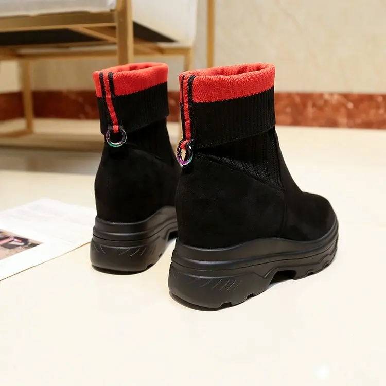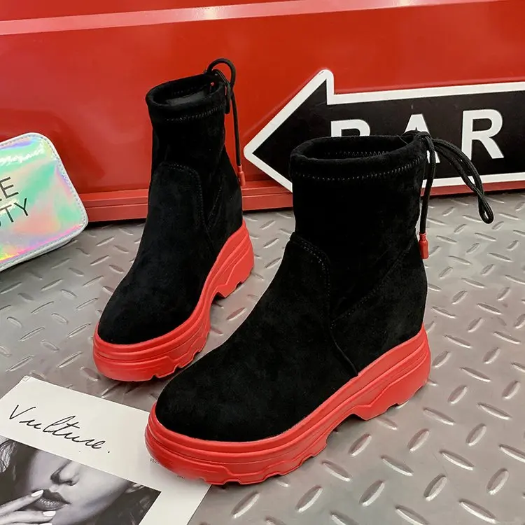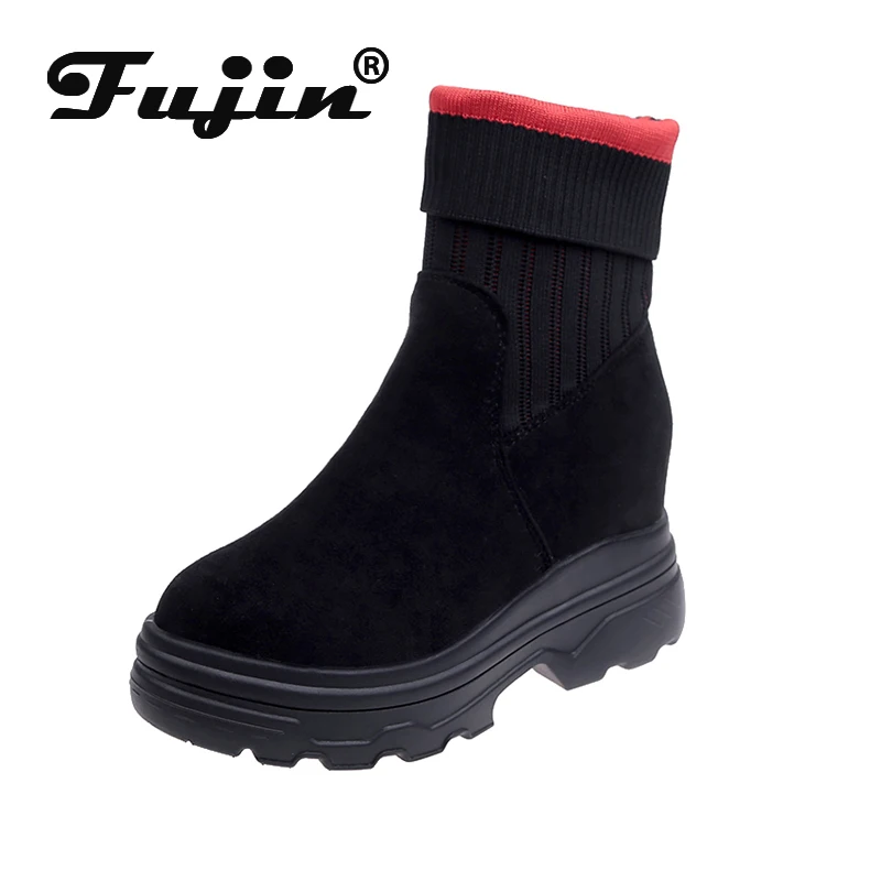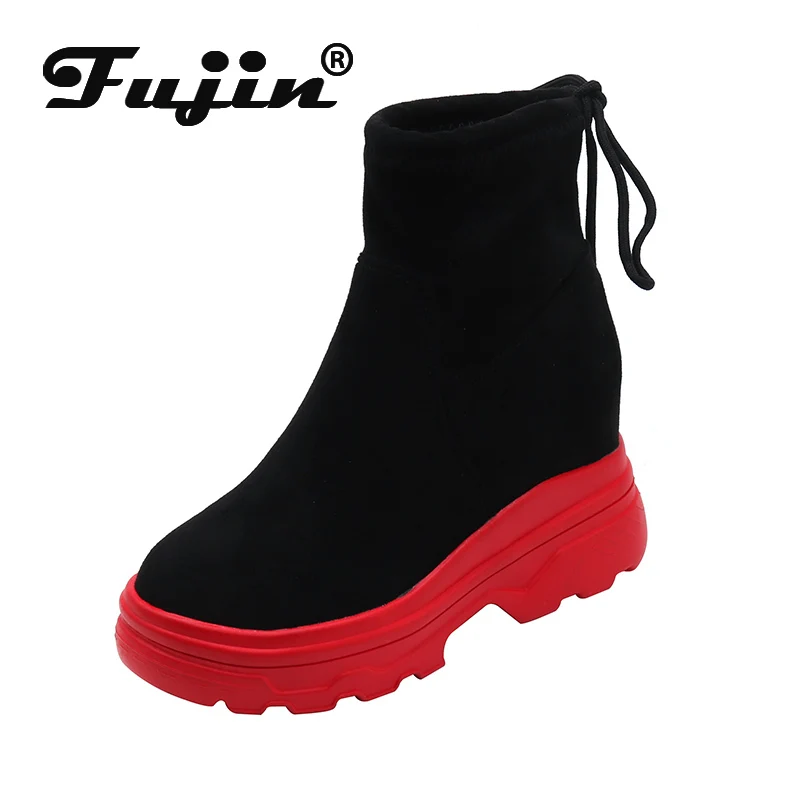 Fujinосенние женские короткие ботильоны из флока на толстой подошве; Кожаные ботинки на танкетке; Модная женская обувь, увеличивающая рост; Цвет Красный