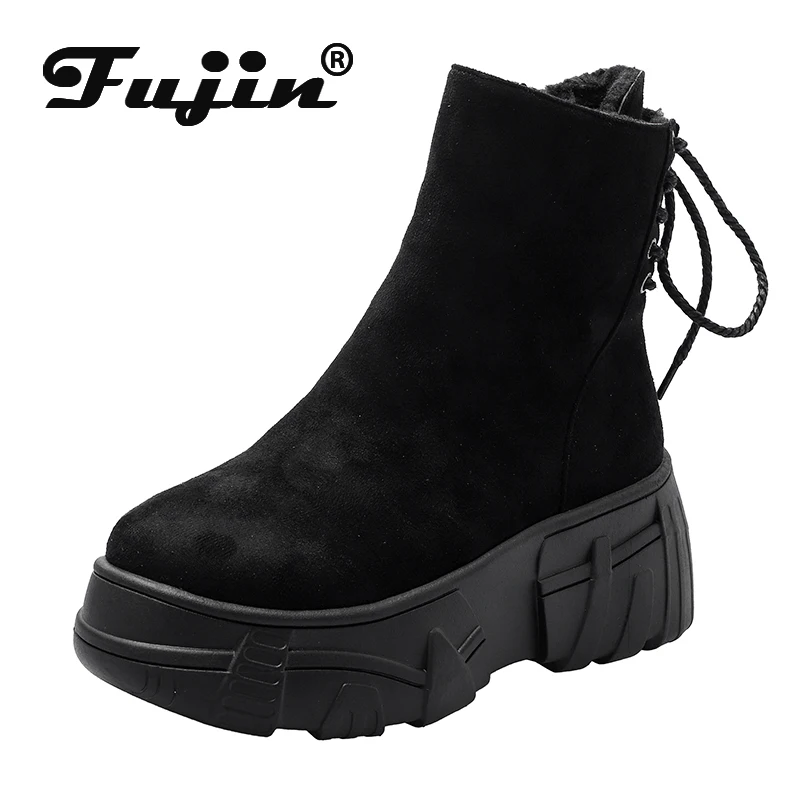 Fujinженские зимние ботинки; Черные кожаные ботинки на платформе; С...