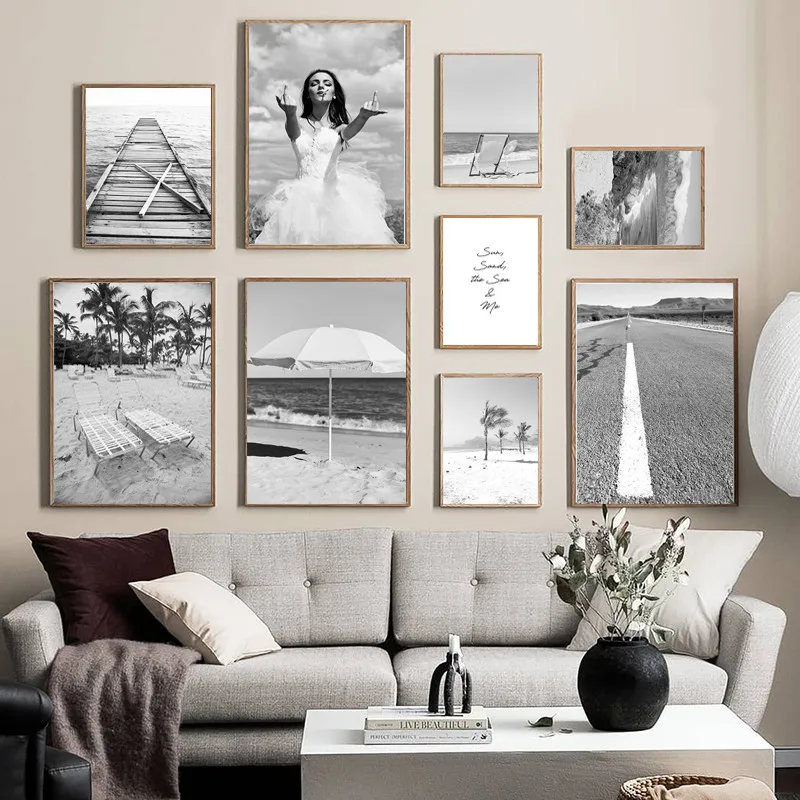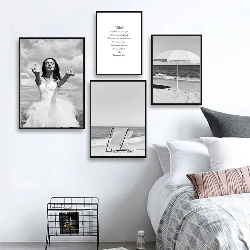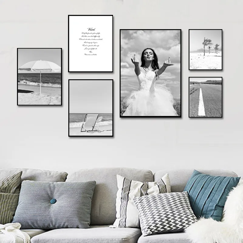 Черно-белый песчаный пляж путешествия цитаты Холст Картина Пейзаж Деревья плакат мост настенные картины Домашний декор HD0090