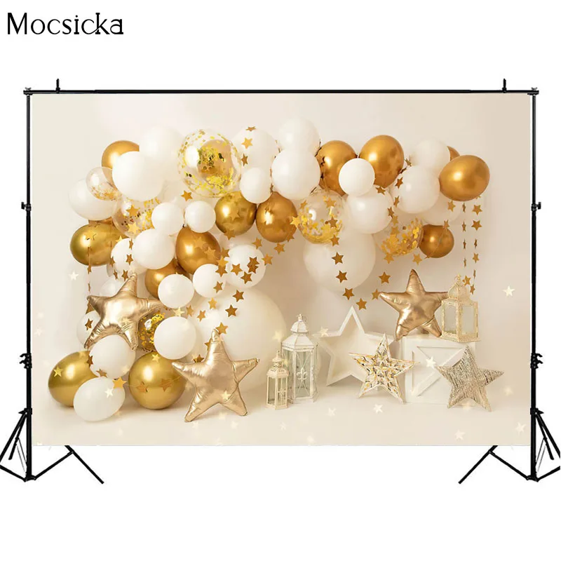Фон для фотосъемки с изображением золотых воздушных шаров и звезд, Белая стена для мальчиков, детского торта, празднование первого дня рождения, декоративный фон для фотостудии