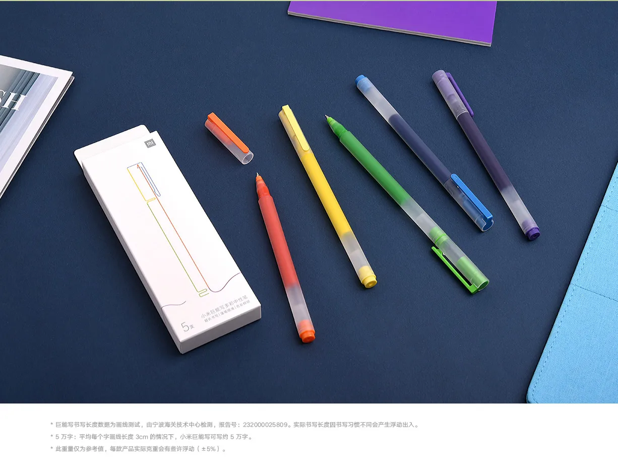 Основные параметры Модель продукта: MJZXB03WC Храктеристика устройства: 0,5 мм гелевая ручка черного цвета Цвет изделия: оранжевый, желтый, зеленый, синий и фиолетовый Спецификация упаковки: 5 шт./кор.