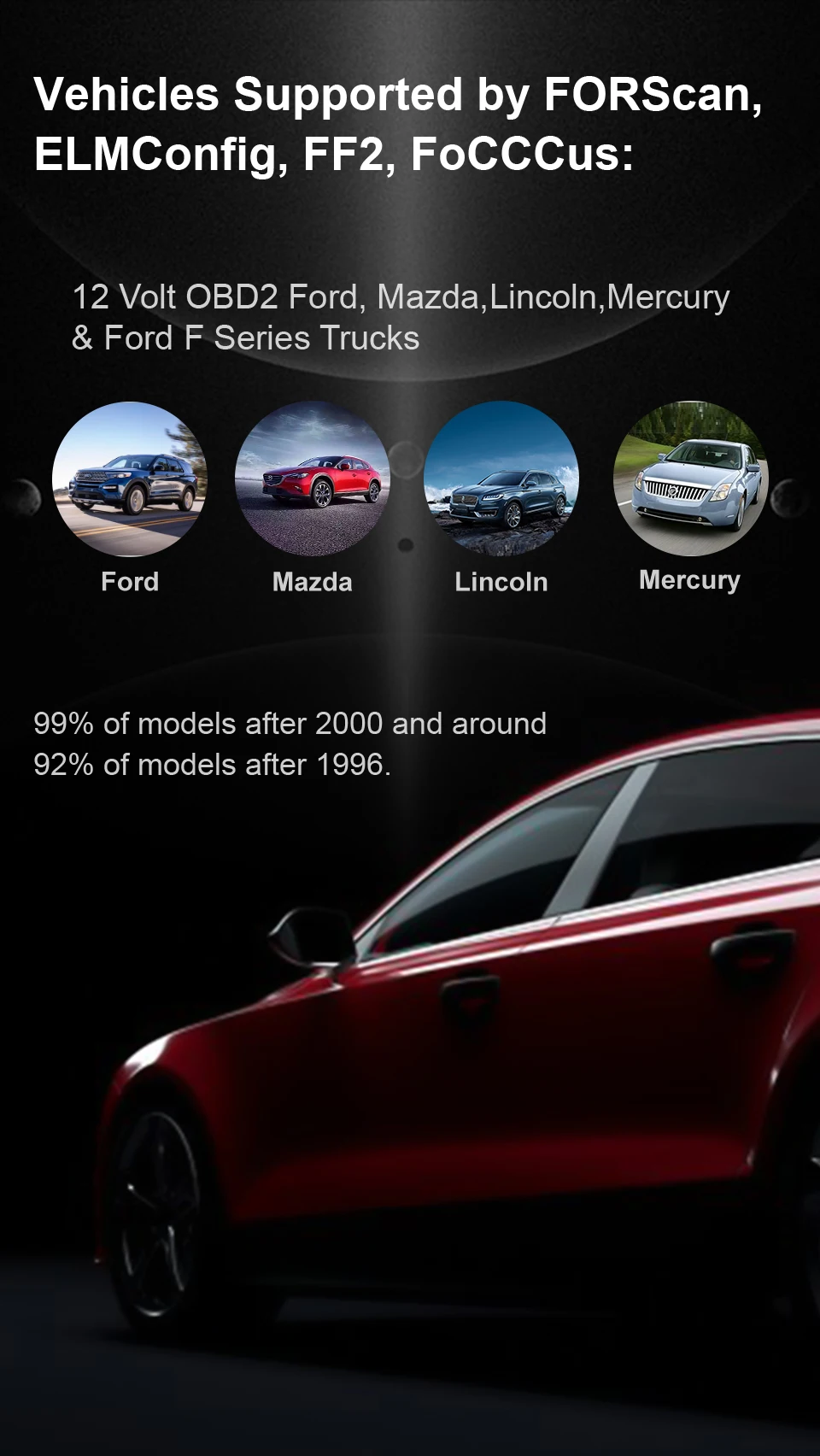 Все автомобили Ford, Mazda, Lincoln, Mercury, которые могут быть обработаны поддерживаемыми адаптерами. Это 99% моделей после 2000 года и около 92% моделей после 1996 года (год, когда OBD-2 стал стандартом в США).● Примечание: Новинка 2019 + Mazda 3 и CX-30 не поддерживаются