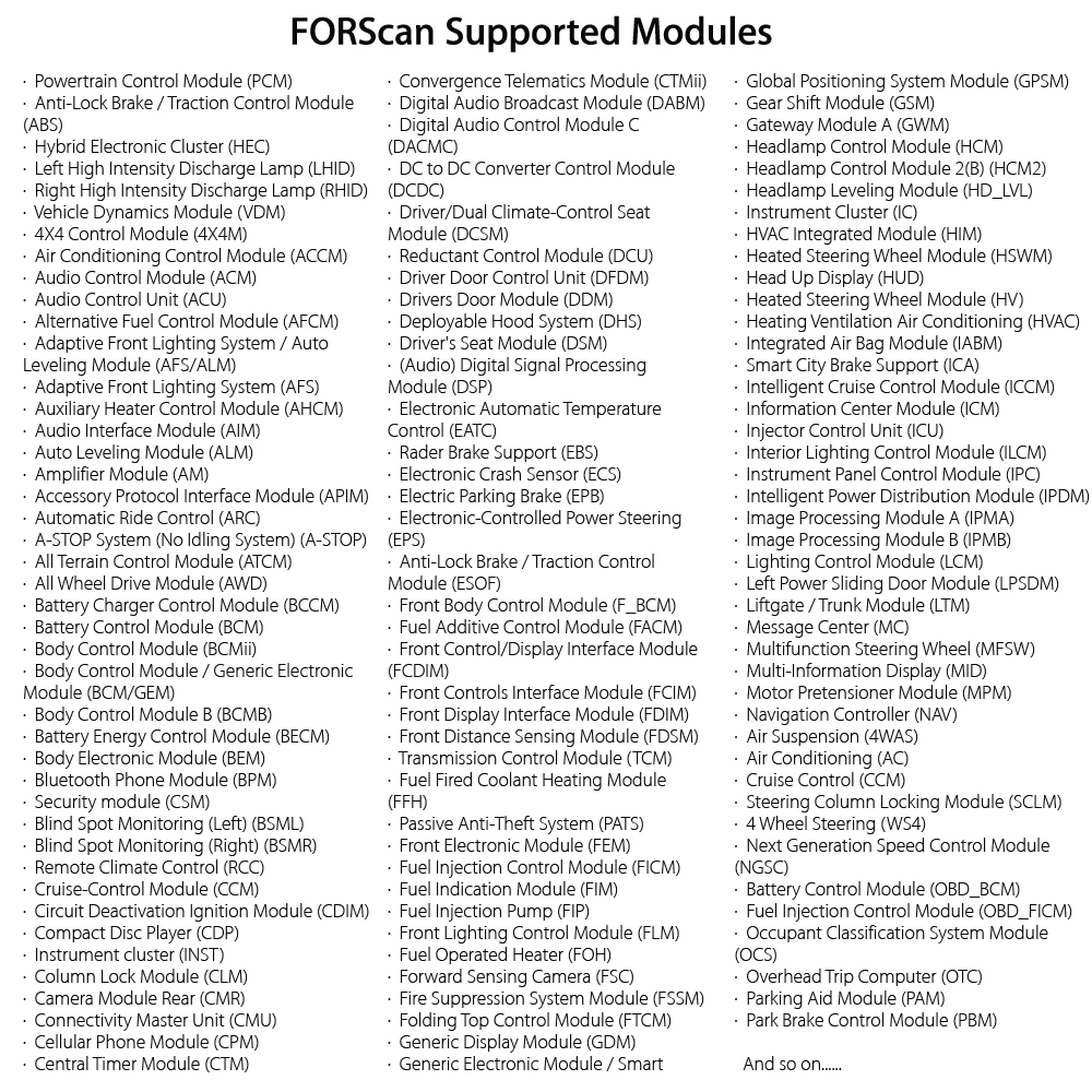 FORScan может обнаруживать модули, которые не видны для обычных OBD-II сканеров, может показать вам коды неисправностей, которые никогда не отображаются сканерами OBDII, может показать вам PIDs, которые не поддерживаются любыми OBD-2Сканер, выполните конкретные тесты и процедуры обслуживания.Другими словами, FORScan может делать то, что обычные OBD-II сканеры не могут сделать.