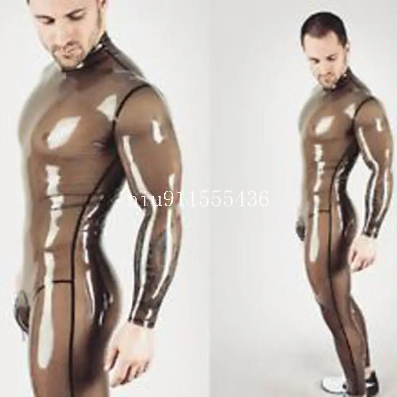 Сексуальный латексный комбинезон ручной работы унисекс прозрачный черный с черной отделкой Облегающий комбинезон для трансвеститов на молнии сзади для мужчин