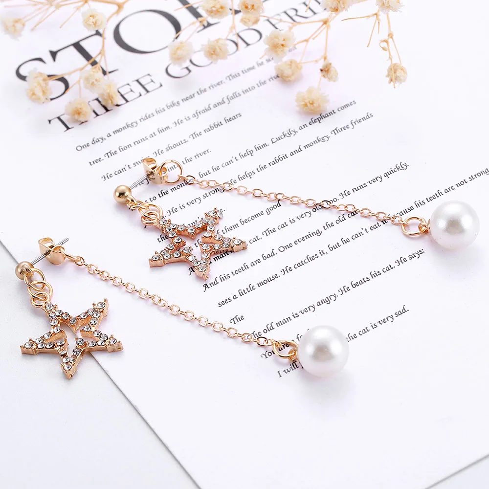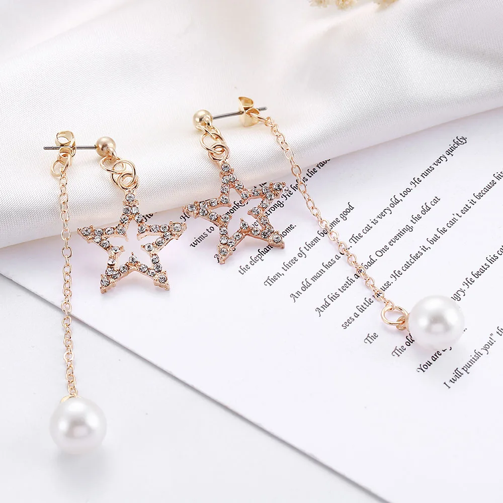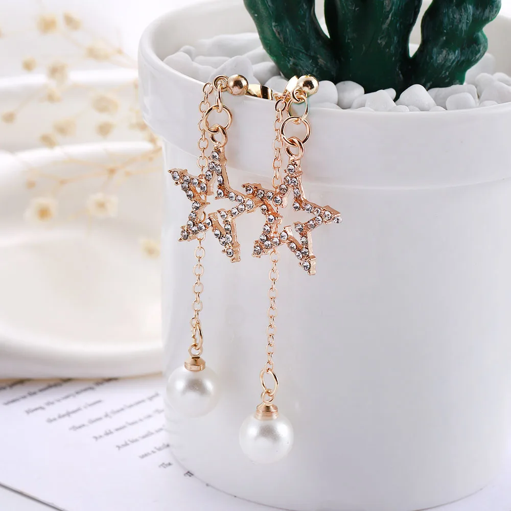 Серьги-подвески в японском и корейском стиле, инкрустированные пятиконечными звездами и висячими жемчужинами, простые и универсальные ювелирные украшения