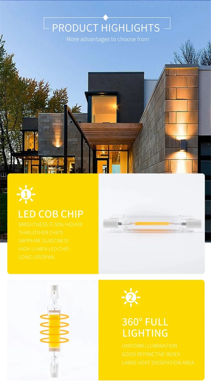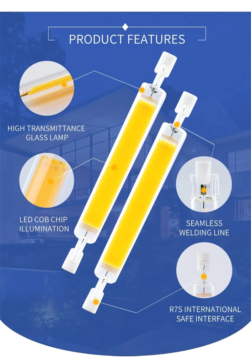 Особенность: 1. Уникальный дизайн для прямой модификации большинства светодиодный ных ламп R7S 2. 360 градусов света для максимальной эффективности осветительного прибора. 3. Компактный размер (13 мм) для идеальной замены как для внутреннего, так и для наружного крепления. 4. Лучше всего заменить галоген R7S в внутренней арматуре. Спецификация: Источник светильник: светодиодный чип COB Материал трубки: стекло Материал порта: керамический интерфейс Длина: 118 мм 78 мм Цвет излучения: теплый белый/холодный белый Цветовая температура: 2800-3500K (теплый белый) ;6000-6500K (белый) Входное напряжение: AC 220V-240V Угол свечения: 360 градусов Степень защиты: IP65 Срок службы: 50000 часов Сертификация: CCC CE RoHs