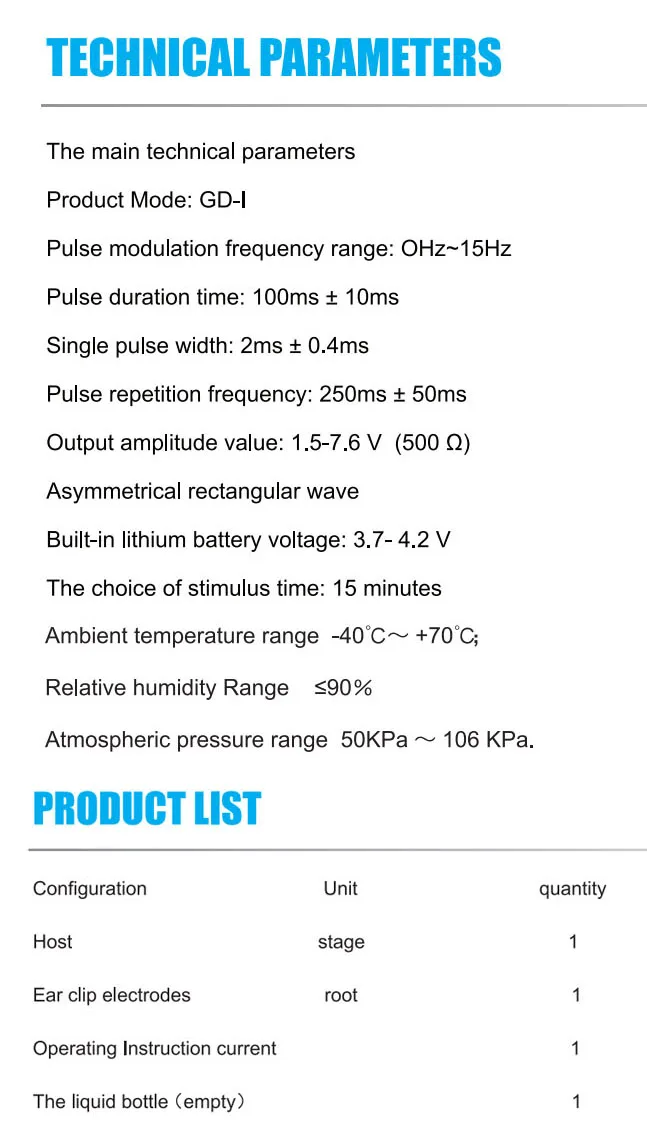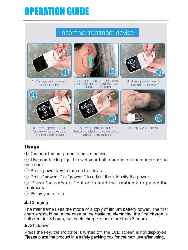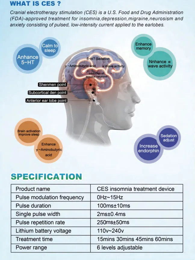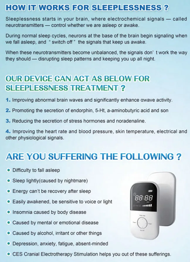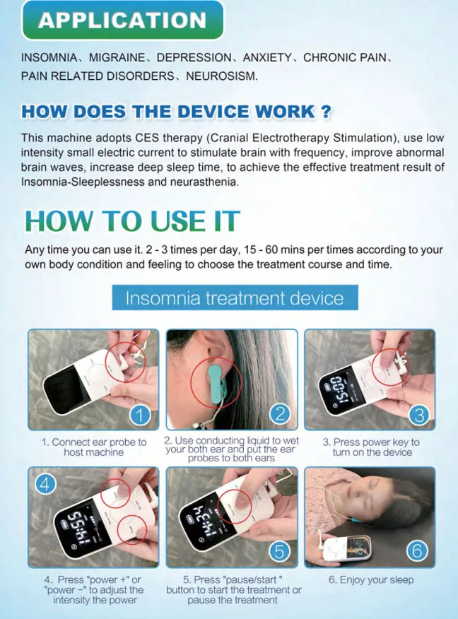 Безболезненный, не требует анестезииБез лекарств, без побочного эффекта, неинвазивныйЭто через профессиональные Лабораторные исследования,Разработка и тестирование.Он безопасен в использовании и имеет значительные эффекты.Есть много случаев успешного лечения.Применение:БессонницаТревогаМигреньДепрессияНейрастенияГоловная боль напряжения (TTH)Хроническая БольБолеутоляющие расстройстваЛюди под высоким давлениемПодходящая сцена:Трудно заснутьСветильник для сна, вызванный кошмарамиБесlistless после пробужденияЛегко пробуждается шумом и светильникБессонница из-за болезниБессонница из-за умственных и эмоциональных заболеванийБессонница, вызванная питьем, раздражением или другими вещамиБессонница, вызванная депрессией, тревогой, усталостью,РассеянныйСпецификация:Название продукта: устройство CES для лечения бессонницыЧастота импульсной модуляции: 0 Гц ~ 15 ГцПродолжительность импульса: 100 мс ± 10 мсОдиночный импульс ширина: 2 г-жа ± 0,4 msЧастота повторения импульса: 250 Гц ± 50 ГцВходное напряжение: 110 В ~ 240 ВВыходное Напряжение: 3,7 ~ 4,2 VПроигрывают амплитуда значение: 1,8 0,2 руды депозит (500s2)Время обработки: 15 минутДиапазон мощности: 6 уровней регулируетсяЧто такое CES?Черепно-электротерапевтическая стимуляция (CES)-это американская едаИ лекарственная добавка (FDA) одобрено лечение дляБессонница, депрессия, мигрень, неврозия и тревогаСостоит из импульсного, низкоинтенсивного тока, применяемого кУшные раковины.Посылка:1x CES устройство для лечения бессонницы1x электроды с зажимом для ушей1 бутылка для жидкости (пустая)1x Руководство пользователя1x USB зарядное устройство2x прокладка для ушных зажимов (35 шт/лист)1x Лазерная иглоукалывание ожерелье с подвеской из турмалина2 бесплатных подарка:1x память хлопок магнитотерапия стелька размер 41-46 (можетБыть обрезанным)1x Мини беспроводной пульт дистанционного управления шейного массажа стикер