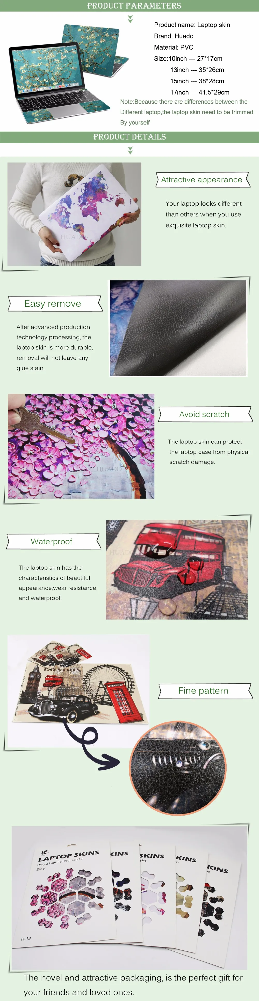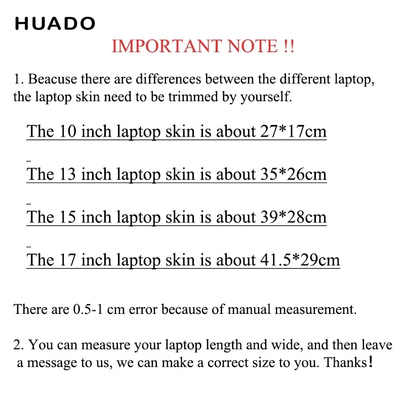 10 дюймовый ноутбук кожи составляет около 27*17 см 13 дюймов ноутбук кожи составляет около 35*26 см, 15 дюймов ноутбук кожи составляет около 39*28 см 17 дюймового ноутбука кожи составляет около погрешность 41,5*29 см составляет 1-2 см из-за ручного измерения. У этой кожи ноутбука есть 1 большая наклейка и 2 маленьких запястья.