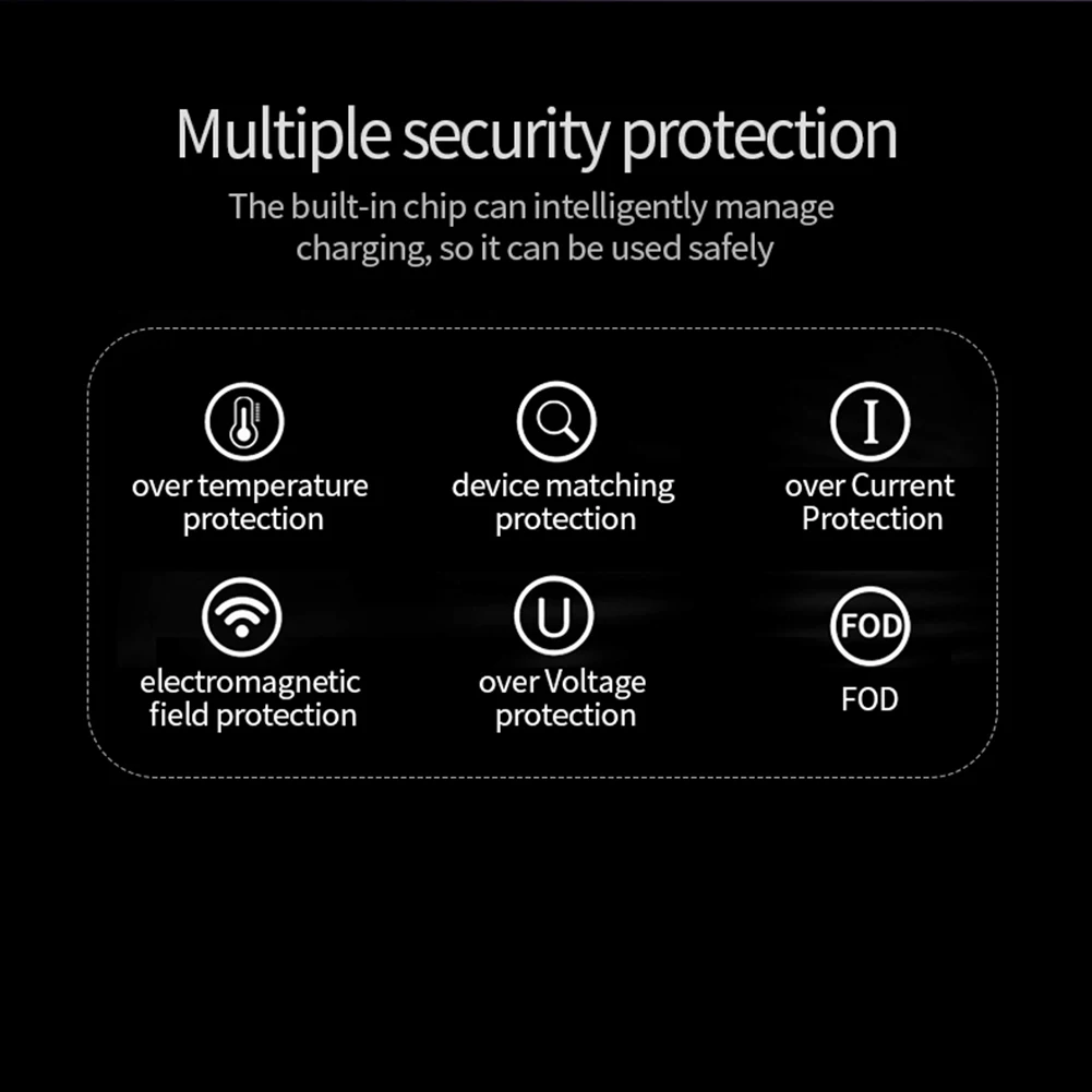 * 3. [Надежная Множественная безопасность]-прошла сертификацию Qi, а многофункциональная интеллектуальная технология защиты обеспечивает контроль температуры, защиту от перенапряжения, защиту от короткого замыкания.