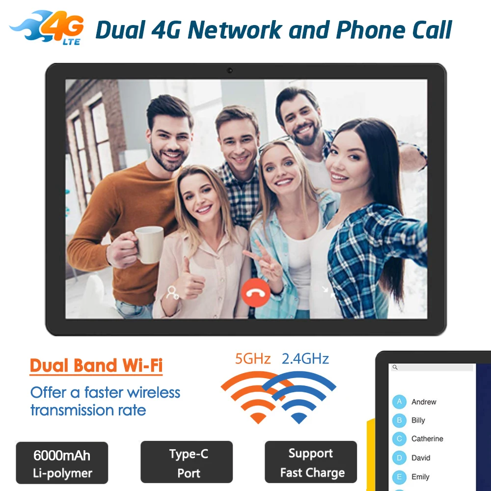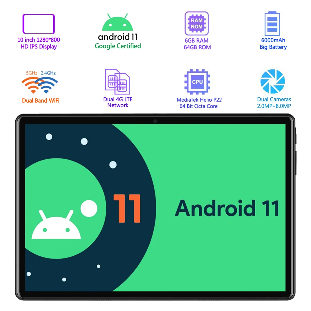 Планшет Perkbox, 10 дюймов, Восьмиядерный процессор MTK, Android 11,0, двойной 4G LTE, телефонные звонки, 6 ГБ ОЗУ, 64 Гб ПЗУ, 6000 МП, Стандартный, Wi-Fi, GPS, батарея мАч
