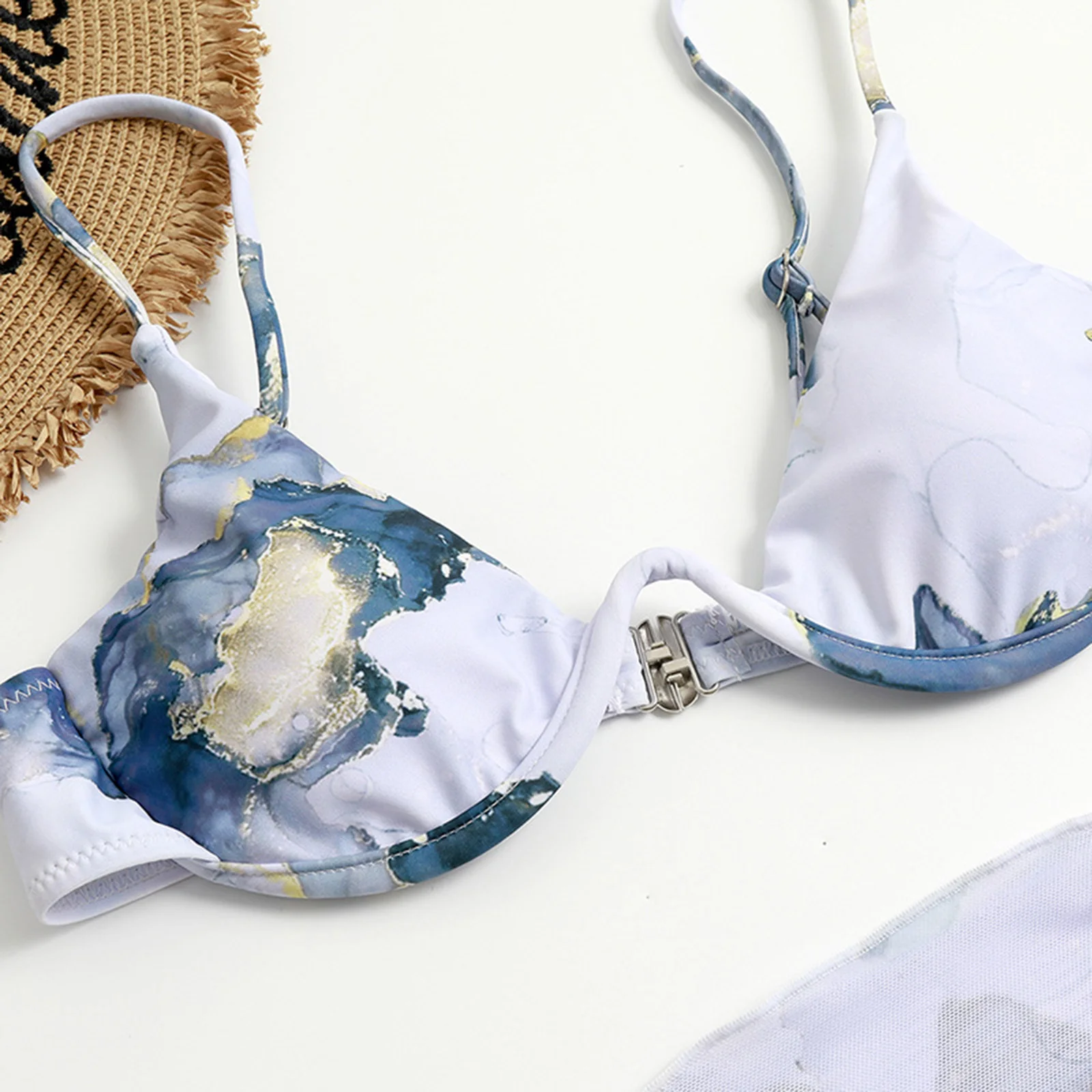Купальный костюм-тройка женский, пикантный комплект бикини с мраморным принтом, на косточках, с запахом и юбкой, саронг, пляжная одежда