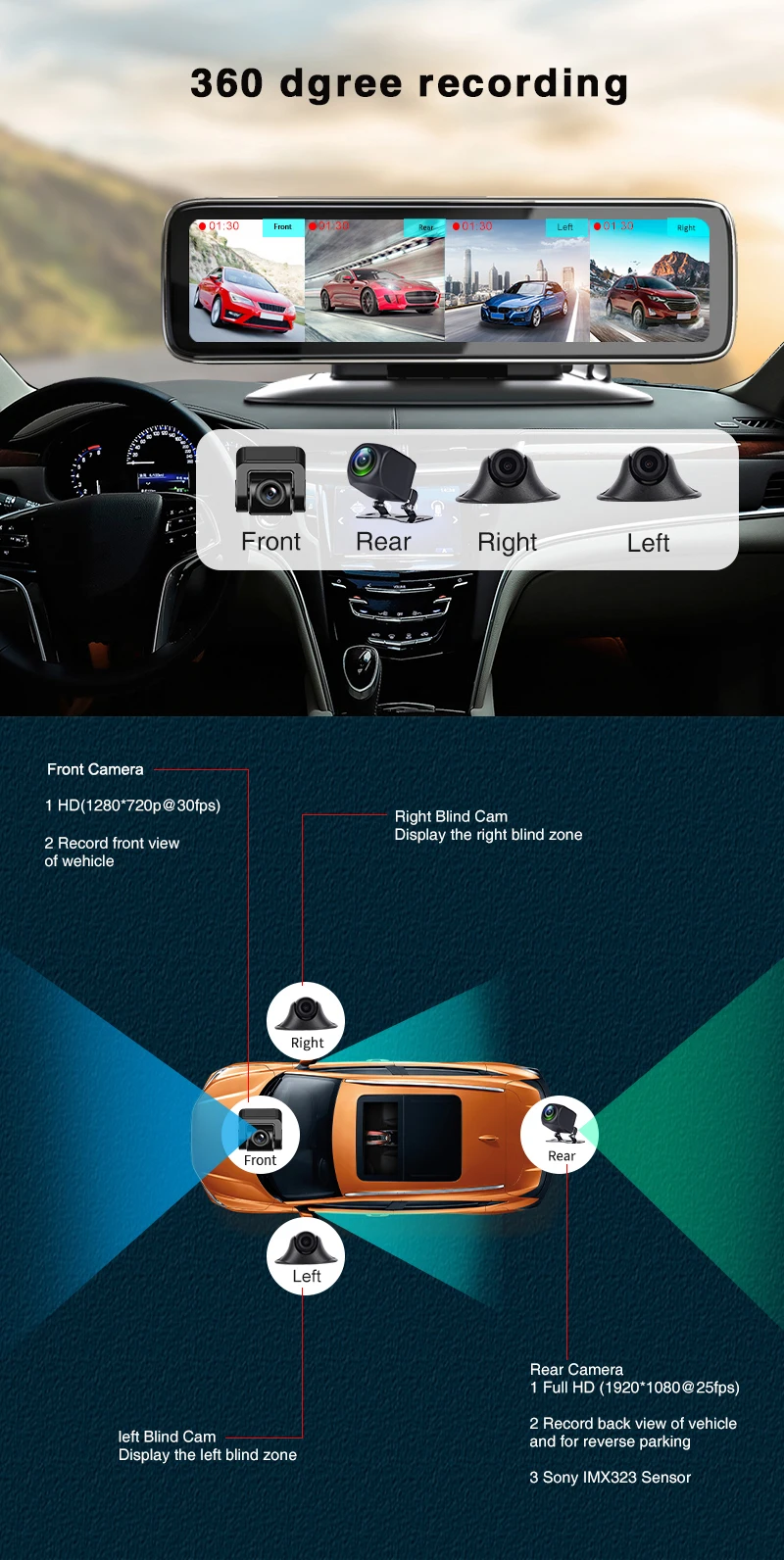 Зеркало-видеорегистратор с ночной съемкой, 4 камеры, 360 , 24 часа, монитор парковки, сенсорный экран 12 дюймов, макс. ток 256 ГБ