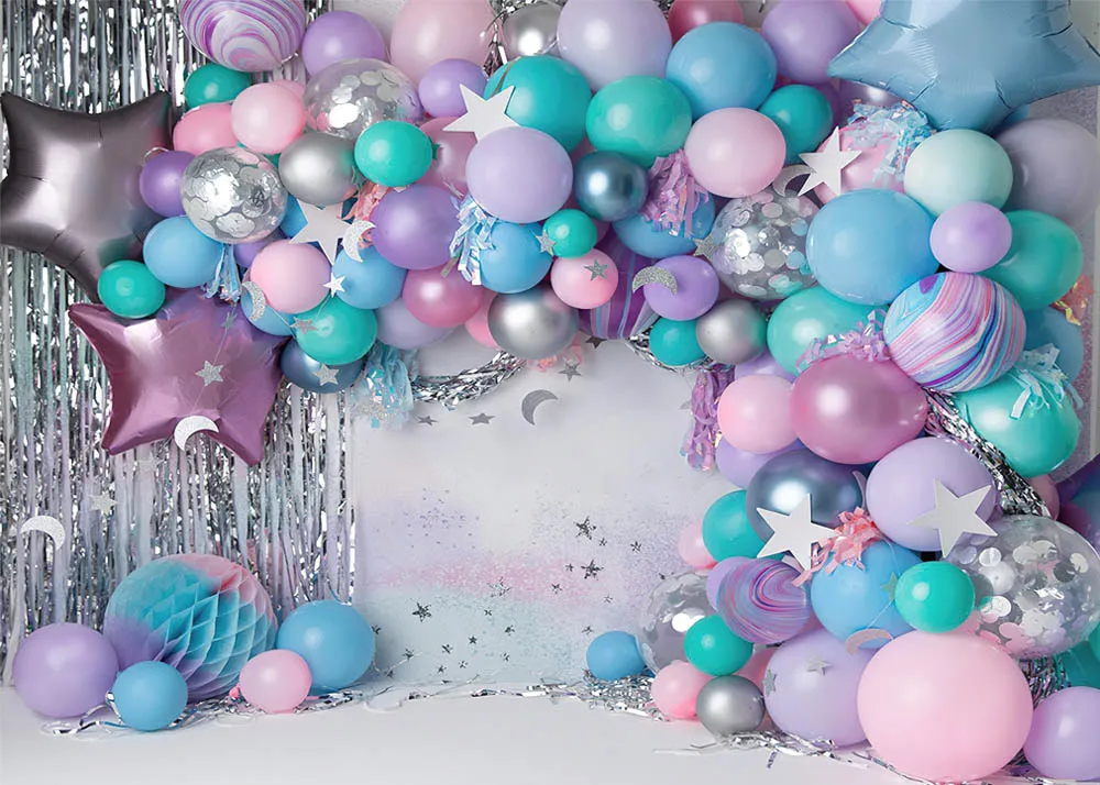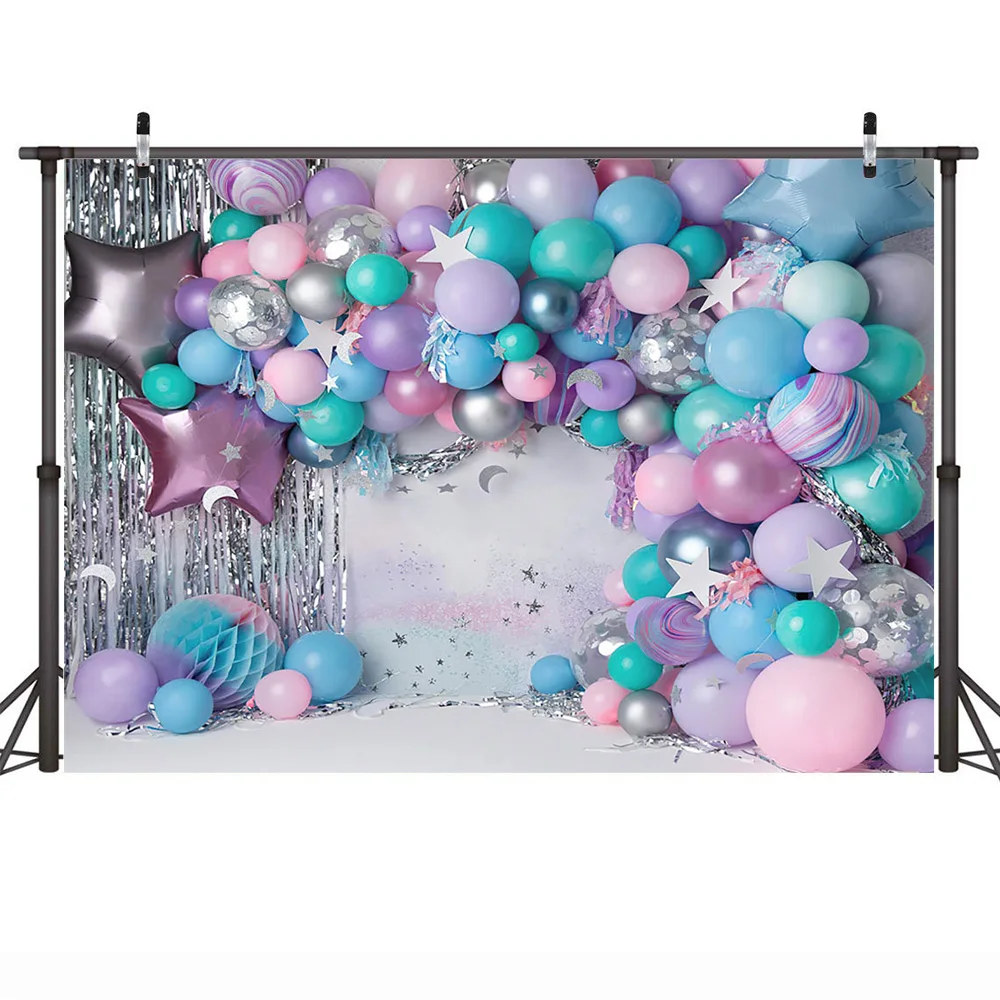 Фон для фотосъемки новорожденных с радужными воздушными шарами, изображением торта, серебряных звезд