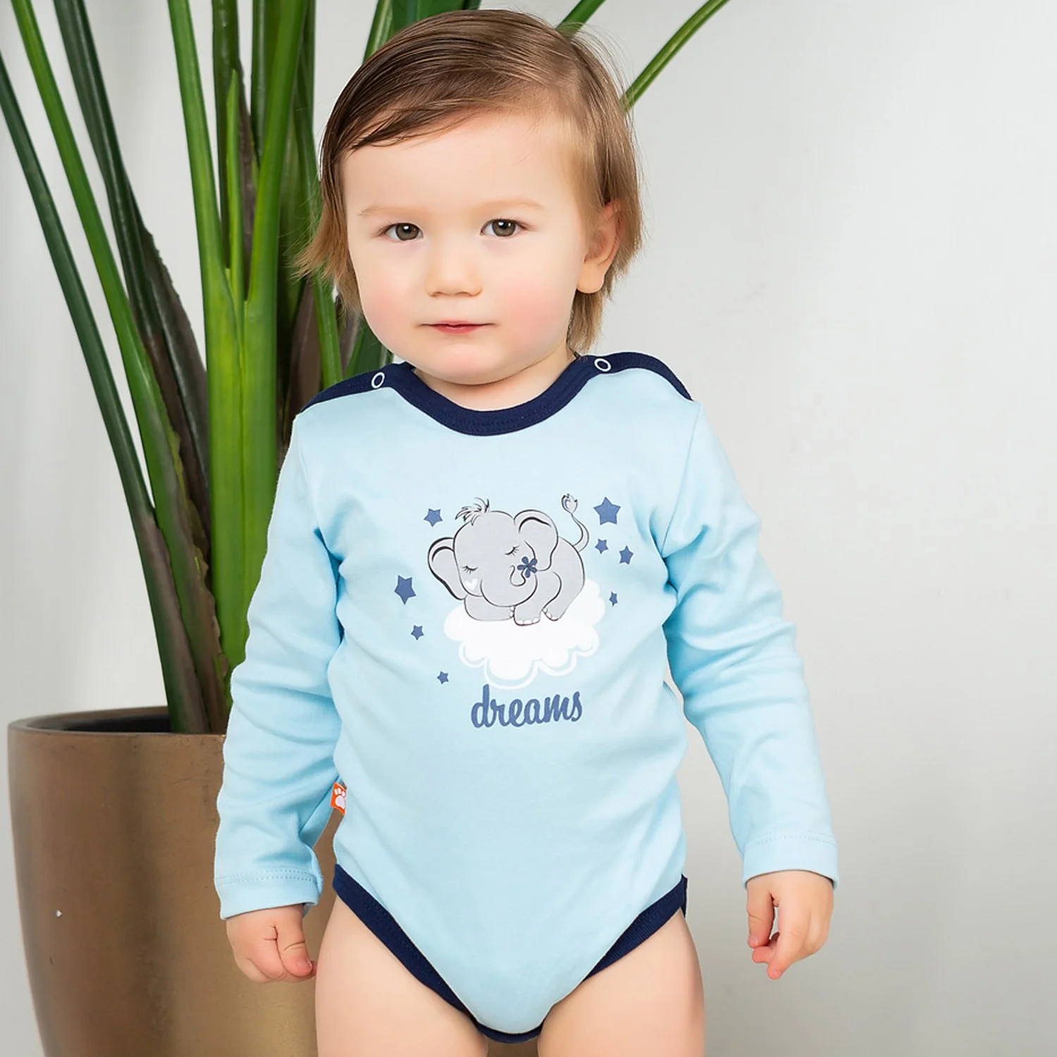 Боди с длинным рукавом для самых маленьких из коллекции "Слоники" подарит ощущение заботы, а также дополнит первый гардероб маленького озорника. Модель выполнена из 100% натурального хлопка (интерлок). Заботливые мамочки оценят удобное расположение плоских кнопок для быстрой смены подгузника или переодевания. Продуманный крой принт на водной основе с изображением веселого слоненка - просто восторг!