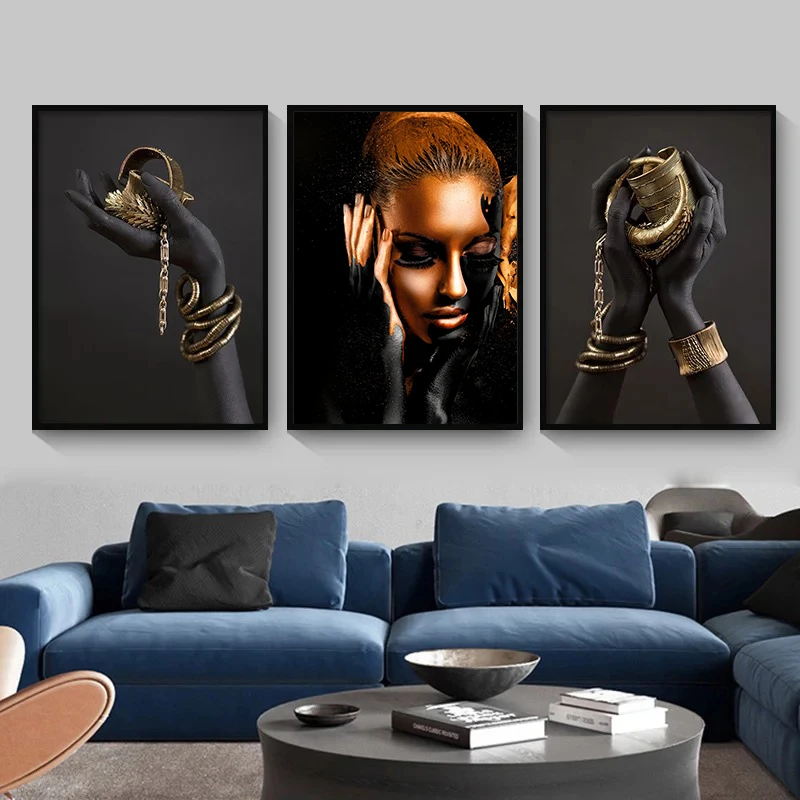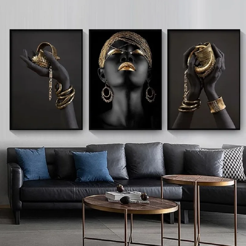 Золотая классическая черная Золотая ручная и Женская картина маслом, Африканское искусство на холсте, плакаты и принты, искусство для гостиной, фрески на холсте