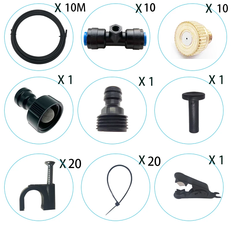 Цвет: как на фото Длина трубки: 10-20 метров Размер трубки: 1/4'' Материал трубки: ПЭ Резьба насадки: 10-24 UNC резьба Отверстие сопла: 0,4 мм Размер адаптера водопроводного крана: 3/4 ''внутренняя резьба Кол-во насадок: 10-20 шт Особенности: защита от капель
