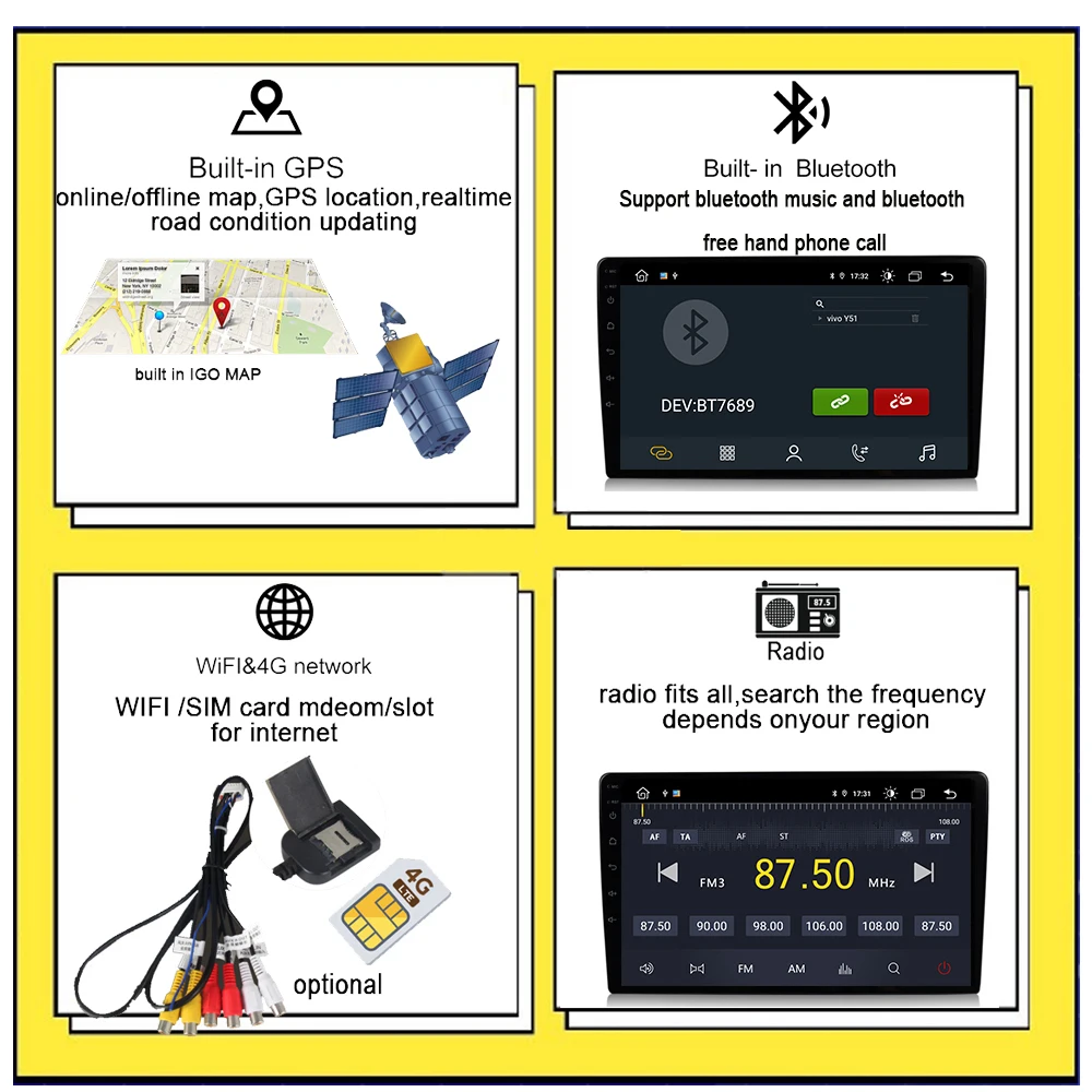 9-дюймовый емкостный экран 2.5D QLED (опционально) + Quad /Octa Core 1,2/2,5 GHZ CPU + 2GB (6GB опционально) Flash + 32GB Memory (64/128GB опционально) + Встроенный Wi-Fi (опционально сеть 4G) + GPS-навигация (карта Поддержка бесплатного обновления) + управление рулевым колесом + зеркальная ссылка + Bluetooth + Встроенный микрофон + FM/AM + RDS (опционально) + Поддержка функции USB ADAS DVR + Функция Europe DAB + 1080P Vedio Play + HD 1280*720 + контроль давления в шинах Система > Поддержка ЯзыковРусский, английский, испанский, итальянский, французский, чешский, арабский, немецкий, иврит, китайский, эстонский, польский, филиппинский, финский, корейский, голландский, хорватский, латышский, литовский, румынский, норвежский, португальский, японский, шведский, тайский, турецкий, украинский, венгерский, словацкий, датский, словенский более 50 видов языков. > Поддержка обслуживания 24H * 7В Nevegetor мы стремимся к лучшему обслуживанию наших уважаемых клиентов, ориентированному на сервис, добросовестной и приемлемой цене для философии нашего бизнеса. Мы с нетерпением ждем возможности сотрудничать с взаимовыгодной атмосферой.