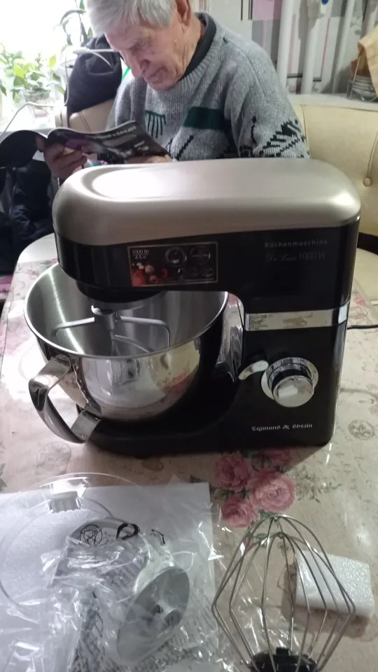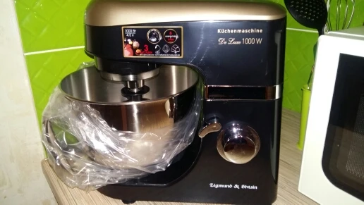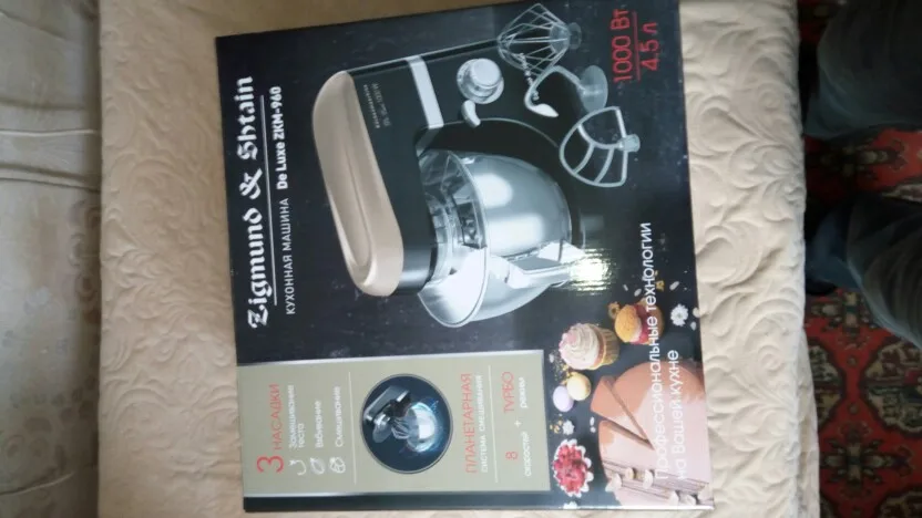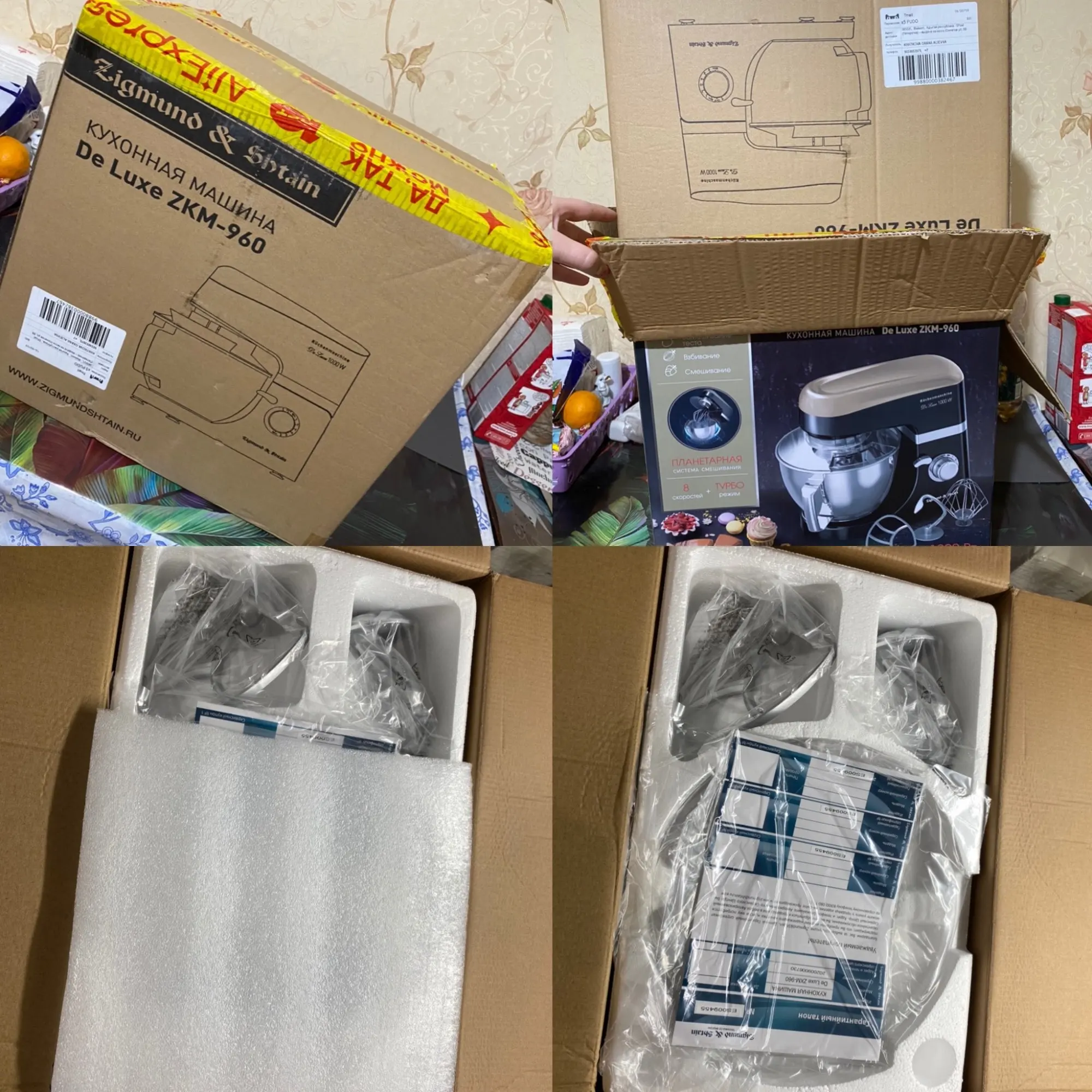 Заказ: 2 апреля 2021г, получили: 8 апреля 2021г (Республика Адыгея). Цена: 4945 руб. Заказ обрабатывали и отпарили через сутки. Заказ получили в магазине «Пятёрочка». Миксер тщательно не использовали пока. Но пробное включение делали. В восторге: чаша 4,5л (надо против часовой стрелки повернуть, чтобы вытащить, соответственно, чтобы устойчиво стояла в поддоне - провернуть по часовой стрелке). «Рукав» миксера откидывается после проворота краника, также и назад ставится. Насадки все металлические!!! (У основного венчика только основание из пластика). Насадки уставляются тоже с приворотом (похоже на дверной шпингалет). Работает умеренно шумно (мой ручной работал с таким же шумом) - можно в квартире и ночью работать им (что для меня важно сейчас). Насадки достают до дна чаши (5мм до дна). Взбивает и 1 белок (что важно для многих). Корпус из металла и пластика. На дне основы миксера присоски - очень удобно, супер-устойчиво. Мощность 1000В. РЕКОМЕНДУЮ!!!
