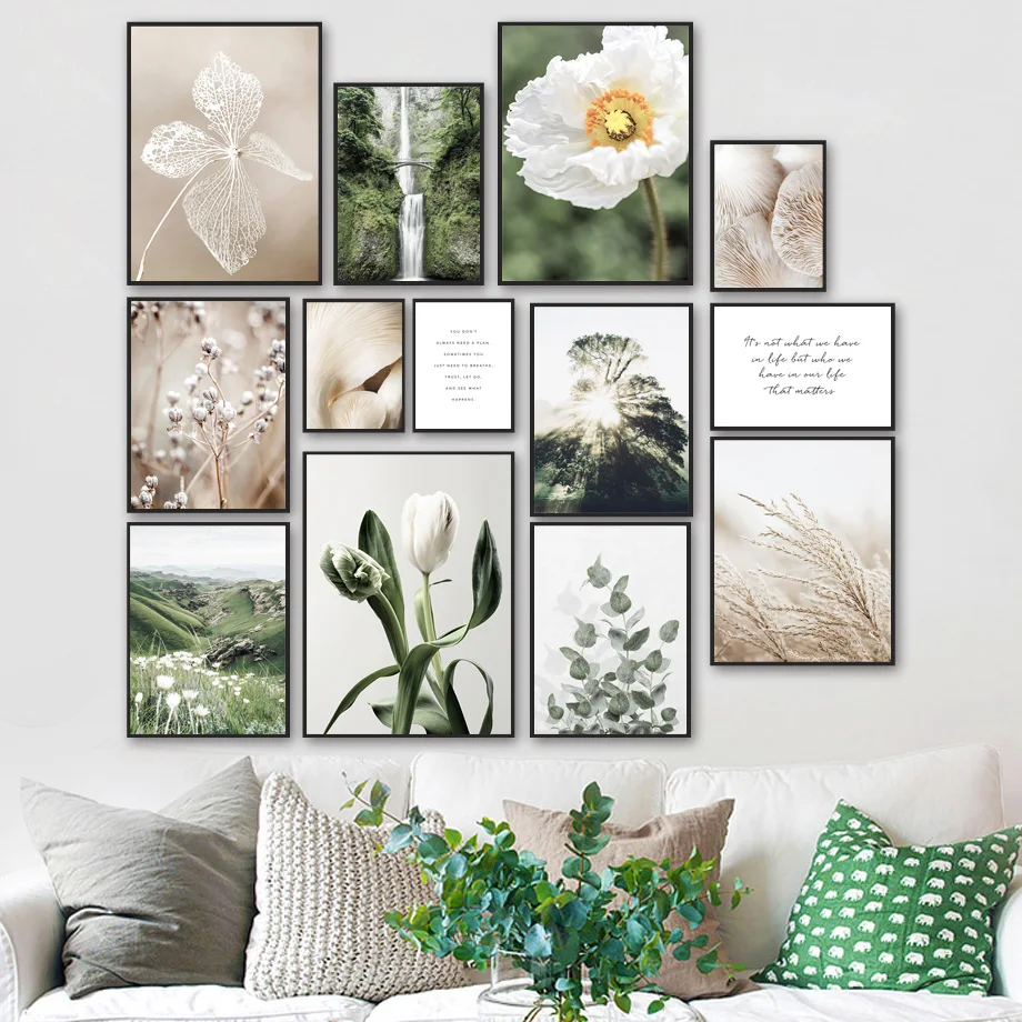 Водопад, мост, тюльпаны, тростники, белый цветок, гриб, скандинавский постер, настенное художественное рисование на холсте, декоративные картины для гостиной