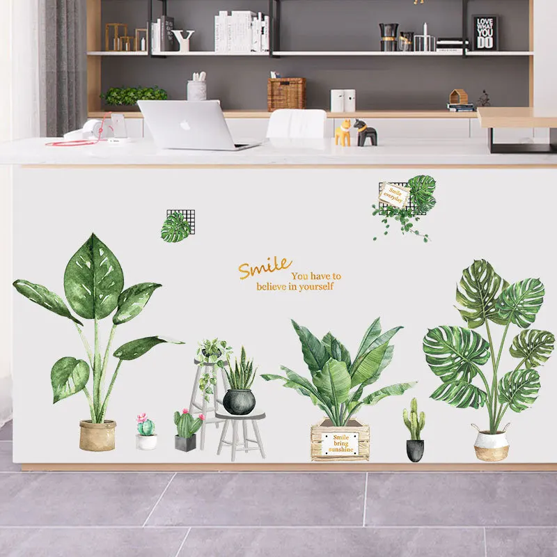 Зеленые листья и ветки, настенные наклейки для гостиной, настенные наклейки, акварельные растения, ПВХ наклейки для спальни, водонепроницаемый плакат