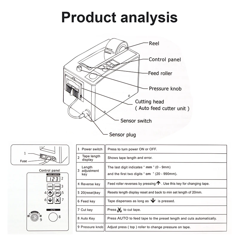 Мощность: AC110V/220V 50/60HZ 25WМаксимальная ширина ленты: 8 мм-80 ммМаксимальный диаметр рулона: ø300 ммСкорость подачи: 150 мм/s Вес: 5,5 кг (лидер + аксессуары продаются отдельно)Размер: 190 (Ш) * 140 (В) * 230 (Д) ммПриложенная лента: клейкая лента, не клейкая лента