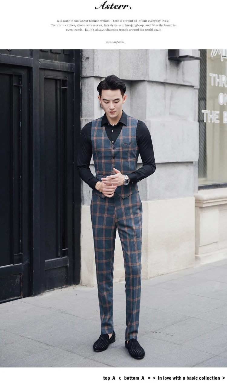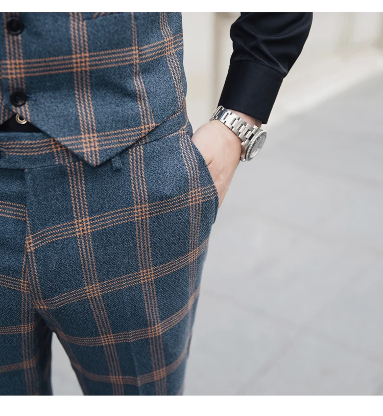 Мужские однобортные деловые свадебные костюмы, полный костюм, мужские Модные классические клетчатые классические костюмы (пиджак + жилет + брюки)