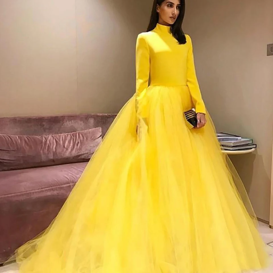Тюлевые официальные платья, атласное вечернее платье для выпусквечерние вечера, желтое вечернее платье с высоким воротом и длинным рукавом, до пола, без шлейфа, новинка на заказ