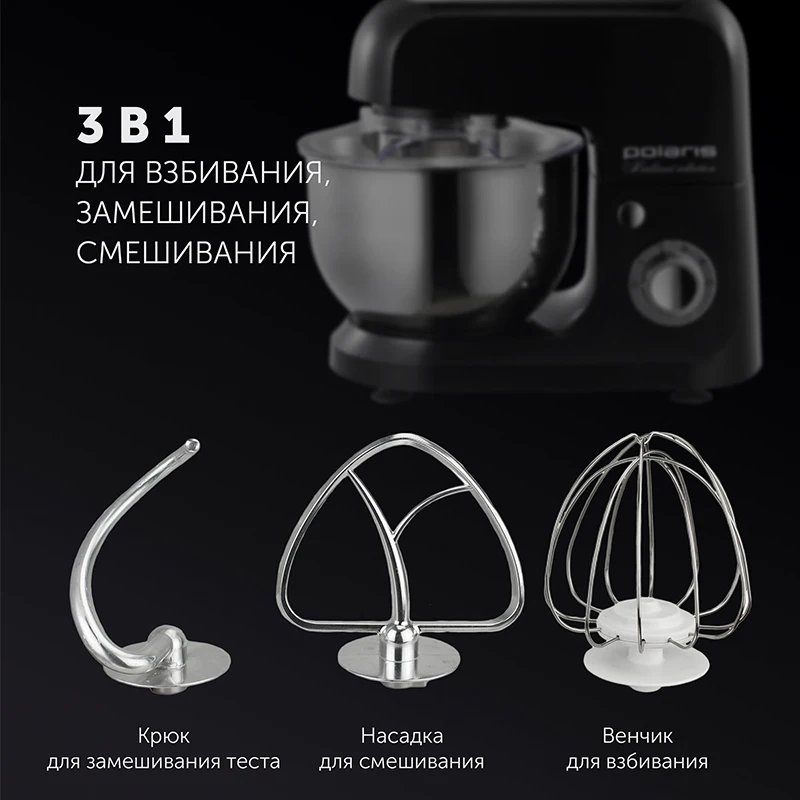 Здравствуйте. ✅Да в комплекте три насадки - для взбинавия венчик, для смешивания и для теста. Малое количество не вымешивает, размазывает по чаше. В целом миксером довольны. берите не пожалеете.