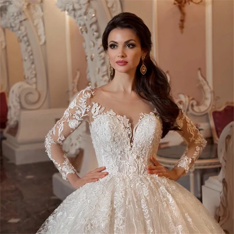 Кружевное свадебное платье с круглым вырезом и длинными рукавами, с...