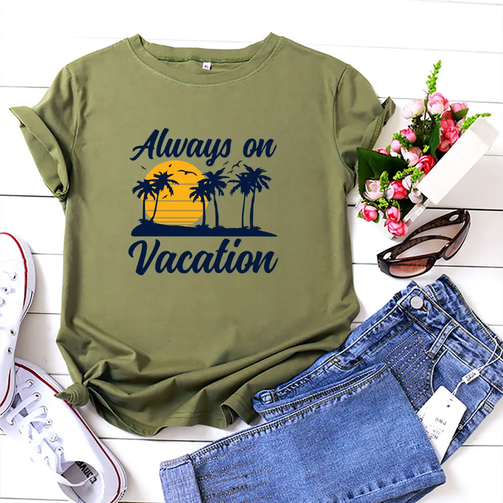 Женская футболка с круглым вырезом, Повседневная футболка из 2021 хлопка с коротким рукавом и графическим принтом всегда на отпуске, новинка 100%