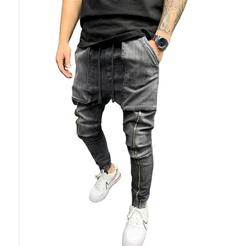 Мужские облегающие джинсы в стиле ретро с большими карманами, синие, черные зауженные джинсы на молнии, высококачественные повседневные спортивные корсеты, джинсы