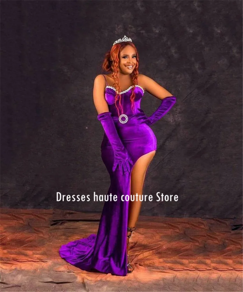 Сексуальное длинное фиолетовое бархатное платье для выпускного вечера платья 2021 сбоку Разделение Блестящие кристаллы из бисера Африканский царь чёрных русалки для маленьких девочек; Платье для выпускного вечера Гала платье