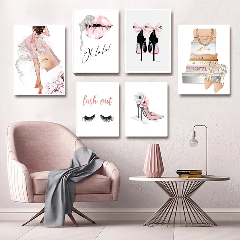Комнатный декор, настенное искусство, современная мода, розовые губы, постер на высоких каблуках парфюмерный мешок, домашняя картина, Картина на холсте, картина
