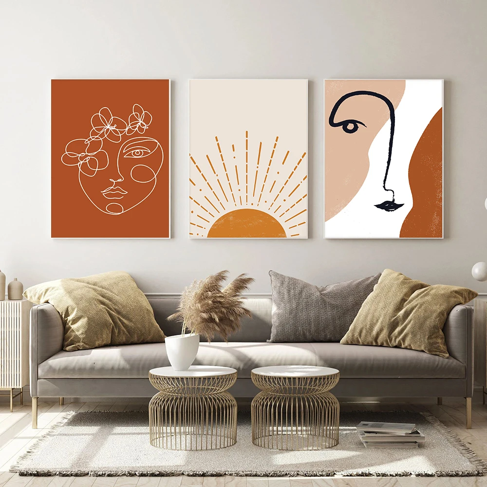 Постеры и принты Бохо с абстрактным пейзажем в скандинавском стиле, Настенная картина, холст с изображением линии лица, Декор, живопись с солнцем и женщиной