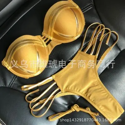 Летний женский новый купальник, однотонное бикини с золотыми вставками, Женский сексуальный купальник