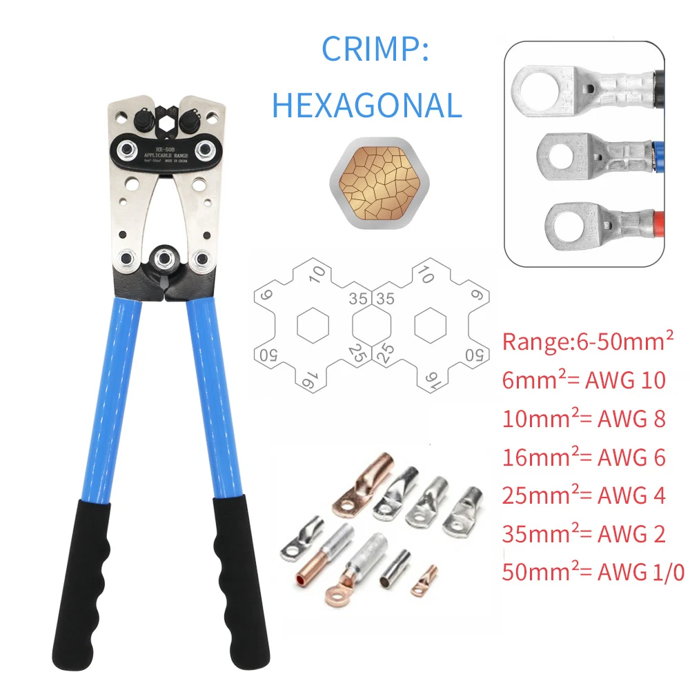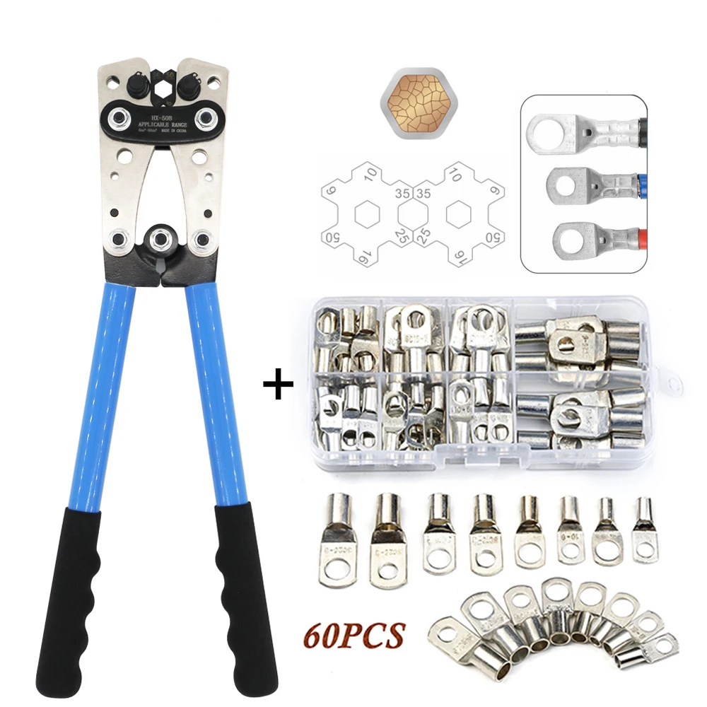 Обжимные клещи 6-50 мм2 AWG 22-10, кольцевые клеммы плоскогубцы для проводов, оголенный кабель, клеммы для аккумулятора, спаянные разъемы, комплект HX-50B