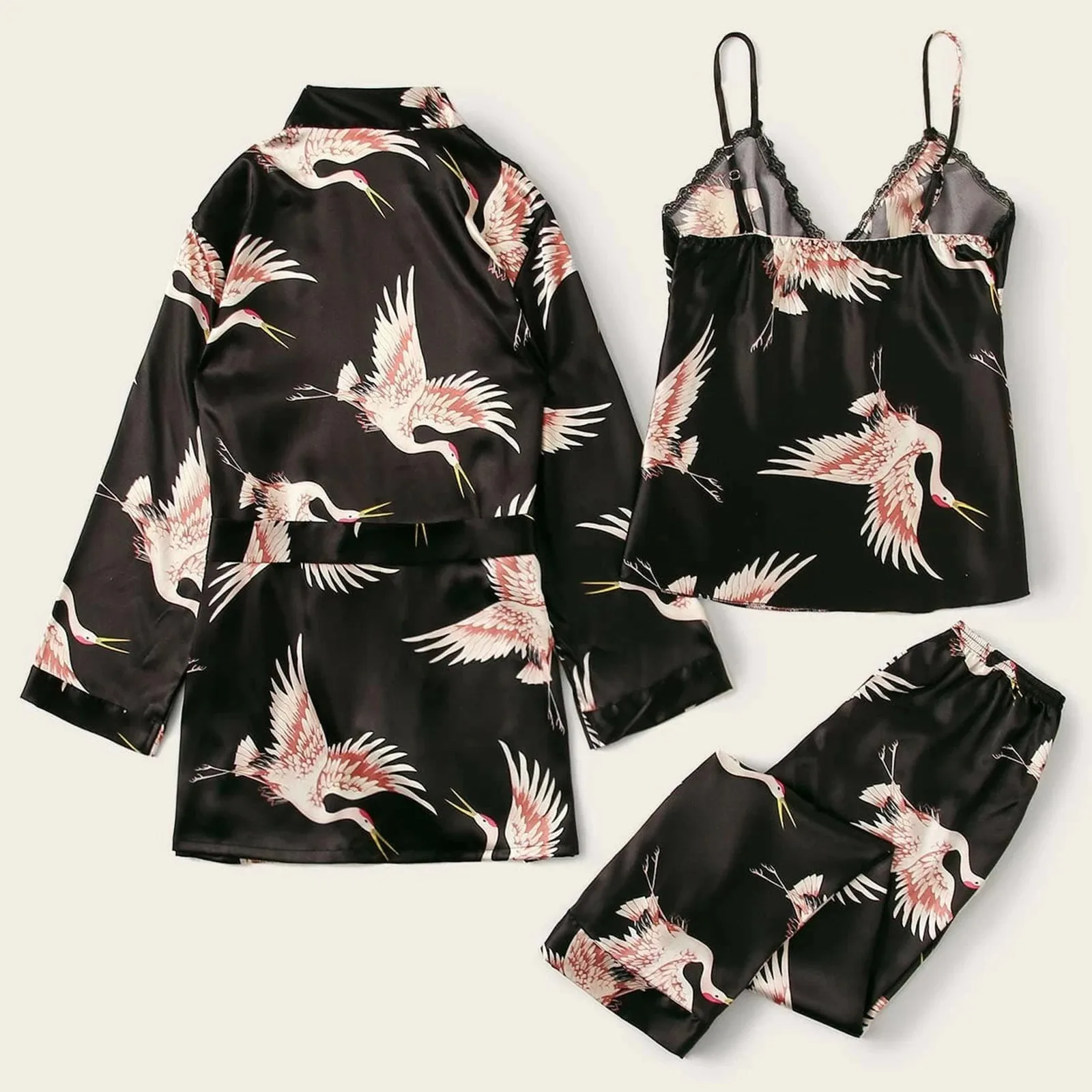 Атласная шелковая пижама, женская ночная рубашка с принтом фламинго, сексуальное мягкое нижнее белье с V-образным вырезом, халаты, домашняя одежда, нижнее белье, 3 шт., распродажа