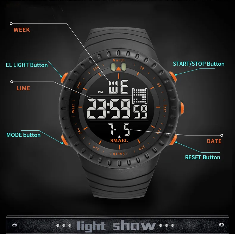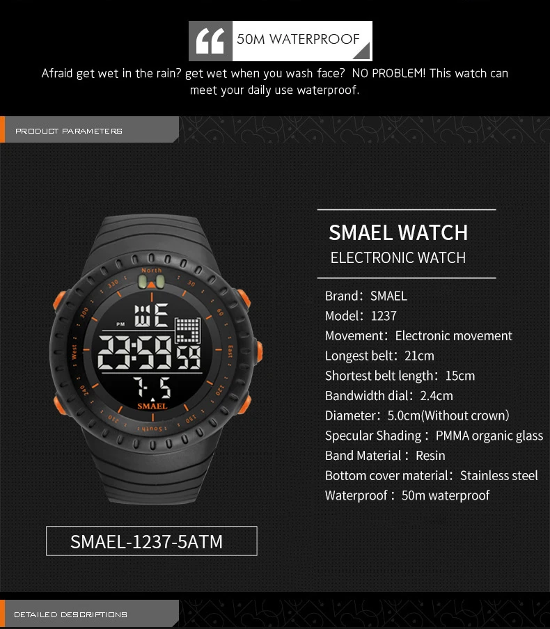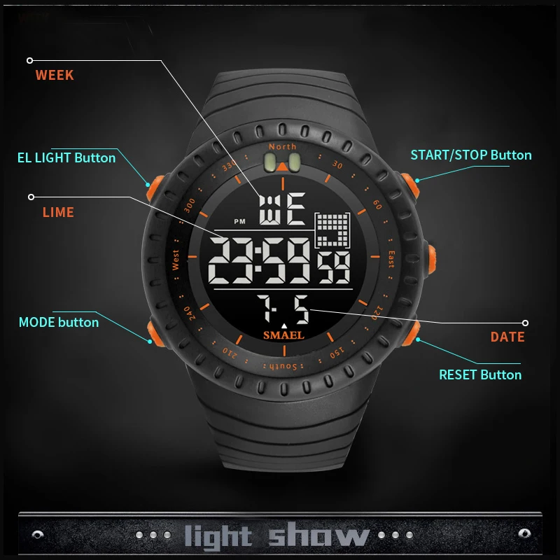 Мужские Цифровые часы SMAEL, 2021, Роскошные водонепроницаемые Современные часы, мужские ежедневные светодиодсветодиодный часы с хронографом, электронные наручные часы 1237