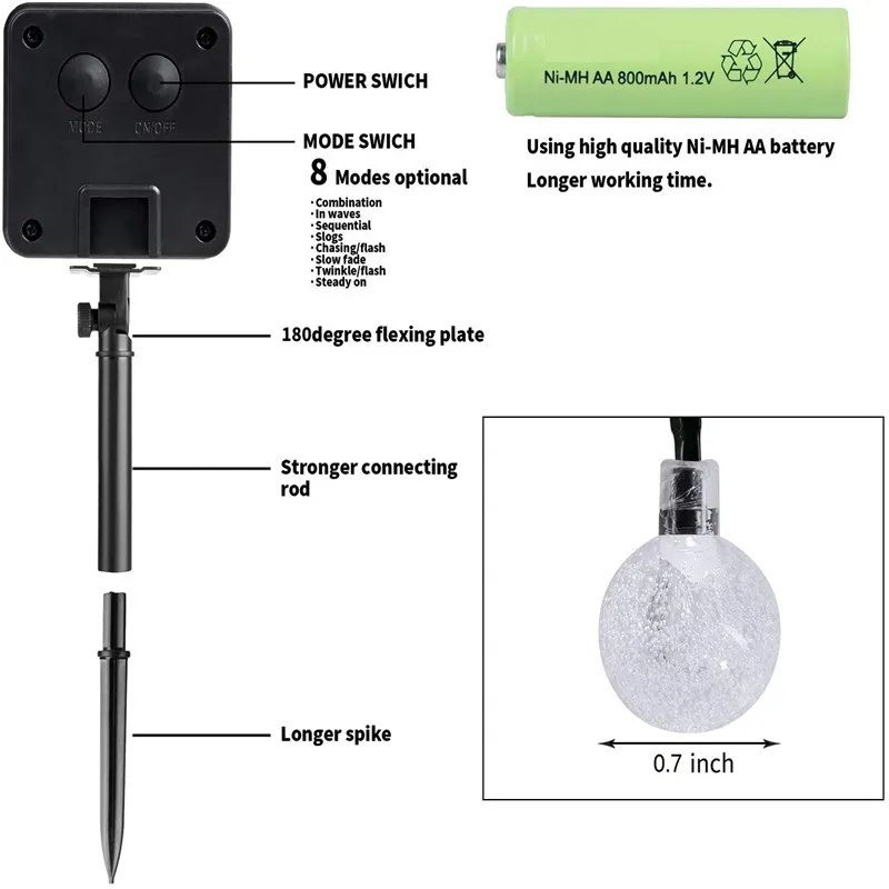 1. Цвет света: теплый белый/многоцветный2. Аккумулятор: встроенный никель-металлогидридный аккумулятор 600 мАч3. Люмен: 100 лм4. Время зарядки: 6 часов5. Время работы: 8-10 часов, общее время работы более 10000 часов6. Количество светодиодов: 20шт7. Аккумулятор: 1,2 V 600MA8. Солнечная панель: 2V 100MA9. Срок службы: 5000 ч10. Рабочая температура: -20 -6011. Длина струны: 9,5 м12. Длина от солнечной панели до первой стойки: 2 м