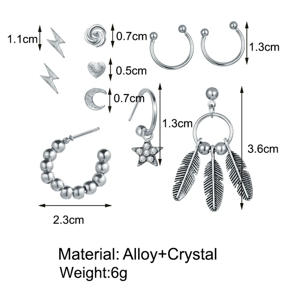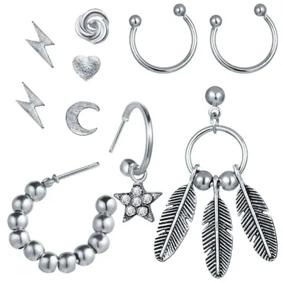 Винтажные геометрические серьги-гвоздики, 10 шт.компл., маленькие серьги с бусинами, цветами и перьями, Серебристые серьги-каффы, ювелирные изделия