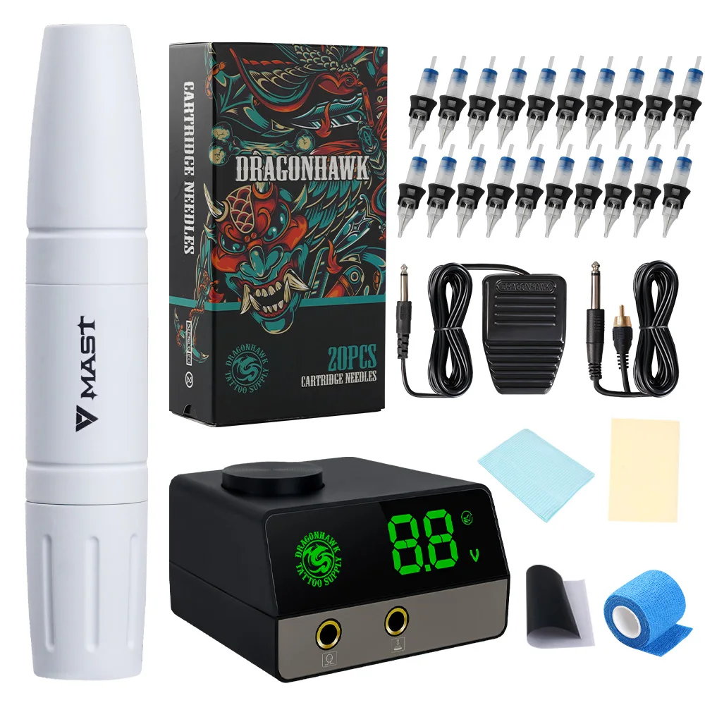 Белая роторная татуировочная машинка для макияжа с двумя пальцами, комплект питания с ЖК-дисплеем и силиконовым чехлом, набор игл для картриджей