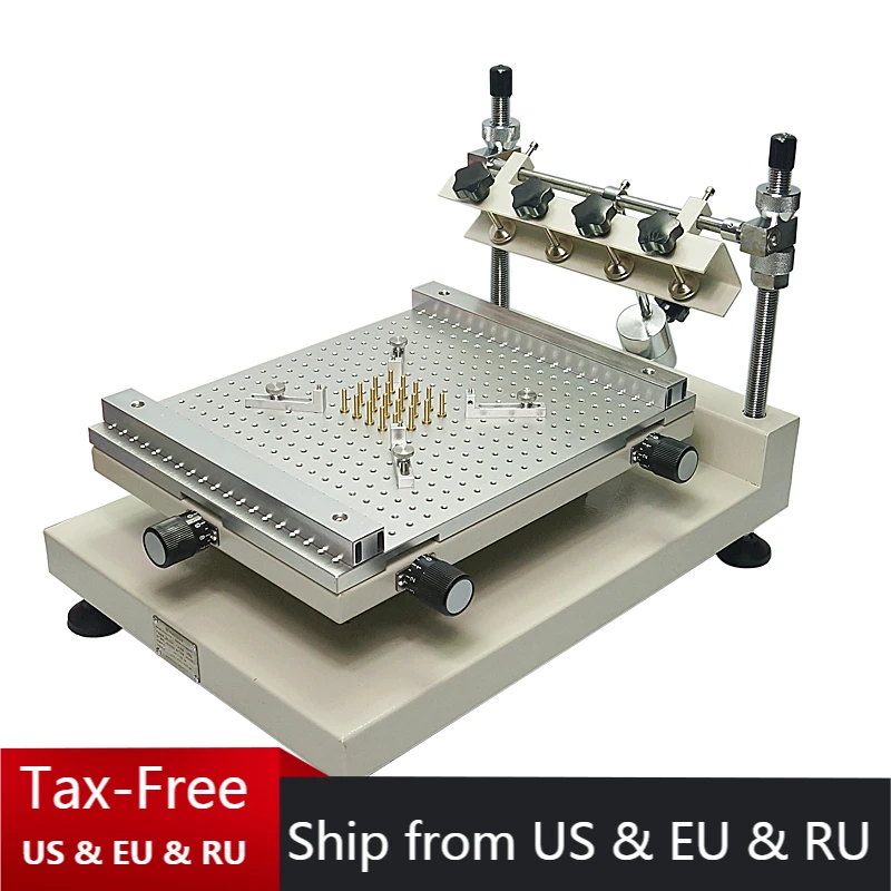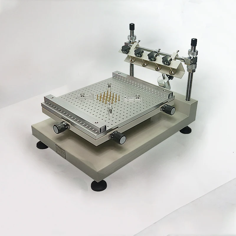 Эксплуатация: Шаг 1: Снимите печатную плату и поместите на четыре позиционирования, поверните ручку регулировки высоты, чтобы сделать модуль печати и контакт печатной платы, а затем Отрегулируйте игла для позиционирования, сделайте печатное отверстие шаблона печати в соответствии с печатной поверхностью печатной платы, фиксированная четыре игла для позиционированияШаг 2: в соответствии с положением размера печатной платы и компонентов платы, установив соответствующую наперсток между четырьмя игла для позиционирования и отрегулируйте ручку регулировки оси X и Y, поверхность печати и отверстие печатной платы шаблон печати точное позиционирование, через фиксируемую ручку.