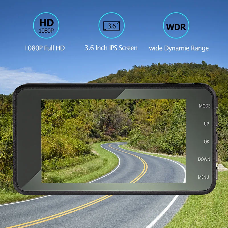 Видеорегистратор J16 автомобильный с камерой заднего вида и двойным объективом 1080P 3,6 "Full HD, циклической записью, G-датчиком, видеорегистратор